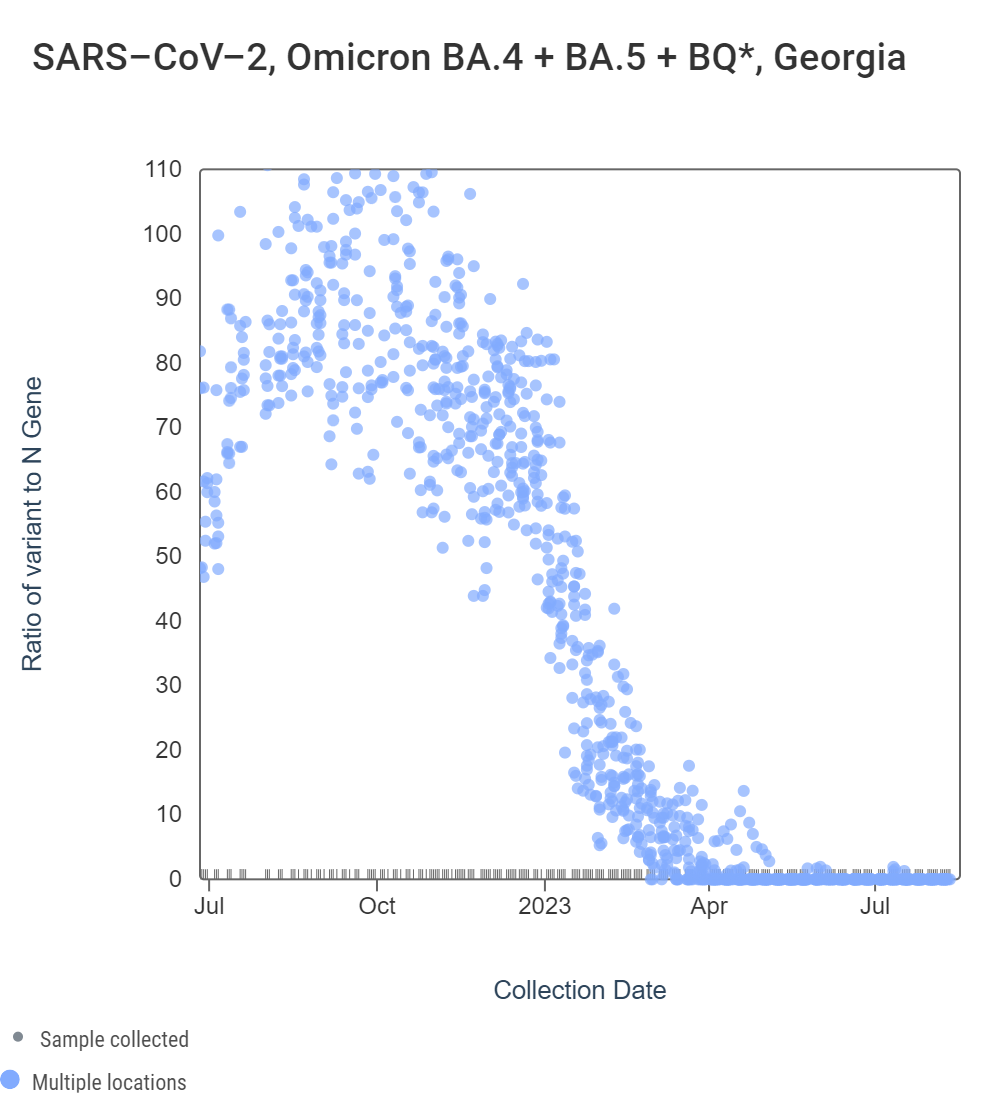 Early in 2023, WWSCAN started testing for XBB* and these results are available to view by selecting 'SARS-CoV-2 View by Variant' on data.wastewaterscan.org. For Georgia sites, data dates back to early February 2023. The ratio of the XBB* mutations/N across all Georgia plants is shown in the left chart below. As the ratio reaches 100%, it suggests that all the SARS-CoV-2 genomes in wastewater have the XBB* mutations. These estimates have not changed much since our last update, and data indicate that the average ratio XBB* mutations/N is ~75% but has ranged from 40-100% recently. This suggests the majority of infections across the communities are caused by XBB*. The right chart below shows the ratio of the BA.5, BA.4, and BQ* mutation/N across all Georgia plants. It can be read the same way as the XBB* chart. The average ratio is close to 0%. Note that our XBB* assay will also detect XBB.1.16, XBB.1.9, and FD.2 (XBB.1.5.15.2*).