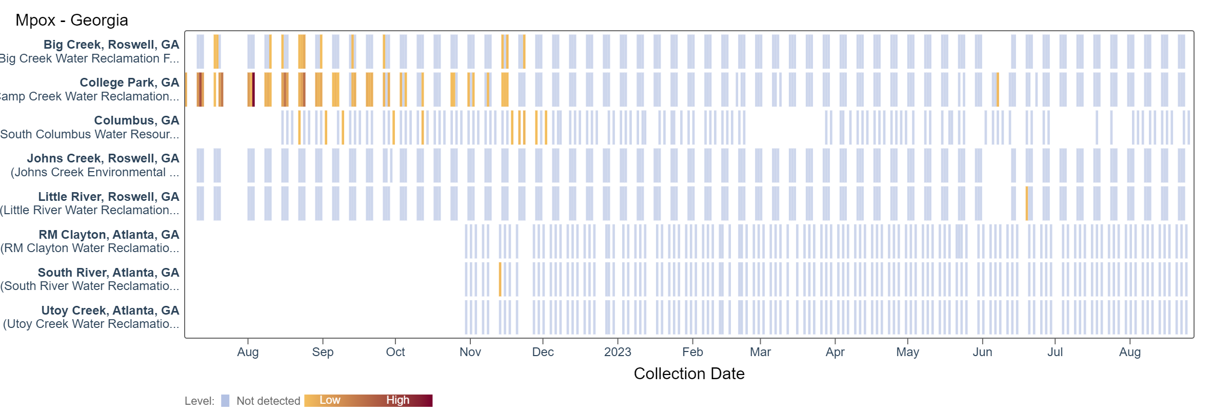 Results are non-detect for mpox for the past 21 days at Georgia plants. This heat map shows data since July 2022. Sites are labeled in the rows and each date a sample was collected as a column. The color blue means the sample was non-detect for mpox DNA and the colors get darker with higher concentrations.