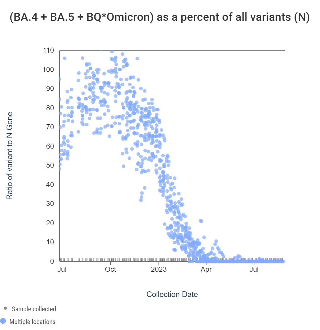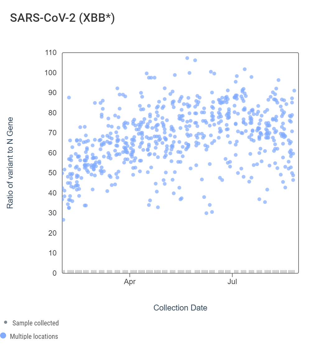 Early in 2023, WWSCAN started testing for XBB* and these results are available to view by selecting 'SARS-CoV-2 View by Variant' on data.wastewaterscan.org. For Georgia sites, data dates back to early February 2023 and can be seen in the chart below. The ratio of the XBB* mutations/N across all Georgia plants is shown in the left chart below. As the ratio reaches 100%, it suggests that all the SARS-CoV-2 genomes in wastewater have the XBB* mutations. These estimates have not changed much since our last update, and data indicate that the average ratio XBB* mutations/N is ~75% but has ranged from 40-100% recently. This suggests the majority of infections across the communities are caused by XBB*. The right chart below shows the ratio of the BA.5, BA.4, and BQ* mutation/N across all Georgia plants. Use this link to view the chart on the site. It can be read the same way as the XBB* chart. The average ratio is close to 0%. Note that our XBB* assay will also detect XBB.1.16, XBB.1.9, FD.2 (XBB.1.5.15.2*), and EG.5. Ho,wever the XBB* targets are NOT present in BA.2.86.