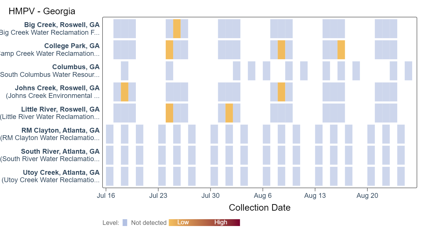 HMPV (human metapneumovirus) RNA has not been detected at some sites in over a month and RSV was not detected within the last two weeks at any Georgia Sites. An analysis of HMPV concentrations showed there is no trend across Georgia sites with the exception of a significant upward trend seen at Big Creek, Johns Creek, and Little River.