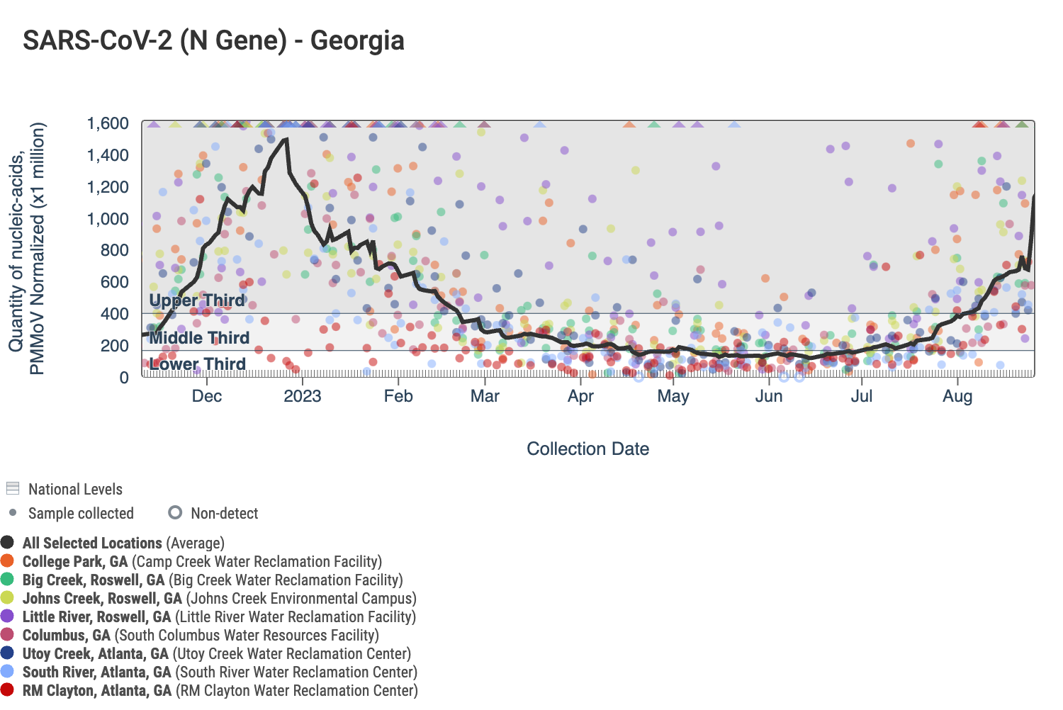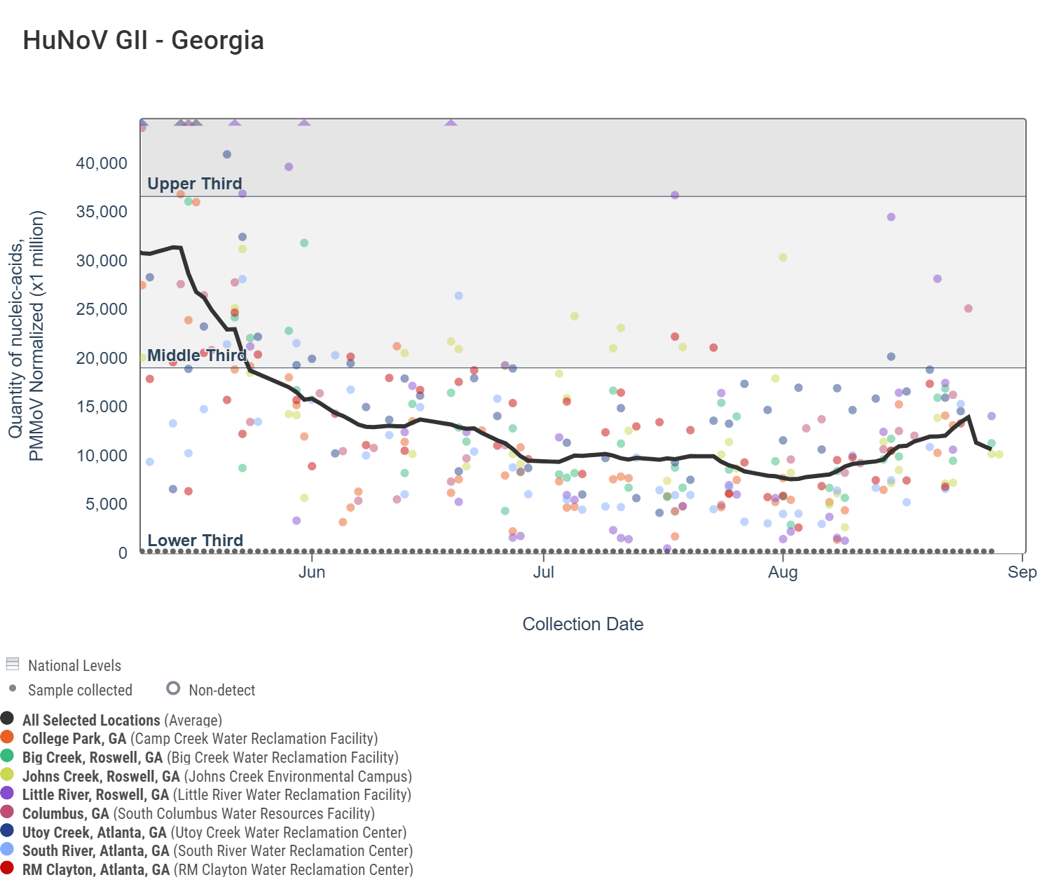 The dark gray line in each chart is a population-weighted aggregated trend line for all 8 Georgia sites when the data is normalized by PMMoV. "National levels" visually benchmark where concentrations fall compared to previously recorded measurements for each pathogen. The aggregated line in the chart below shows that SARS-CoV-2 N gene RNA concentrations continue to be within the upper third level of all concentrations measured in the last year. Additional information on the methodology behind this trend line is available here in the "How are aggregated trendlines determined?" section. More details can be found under the "How are national levels determined?" section here.