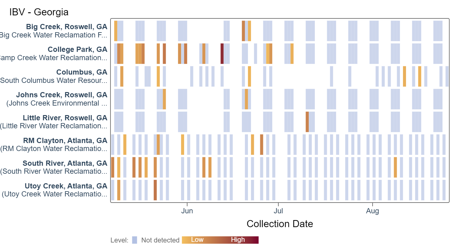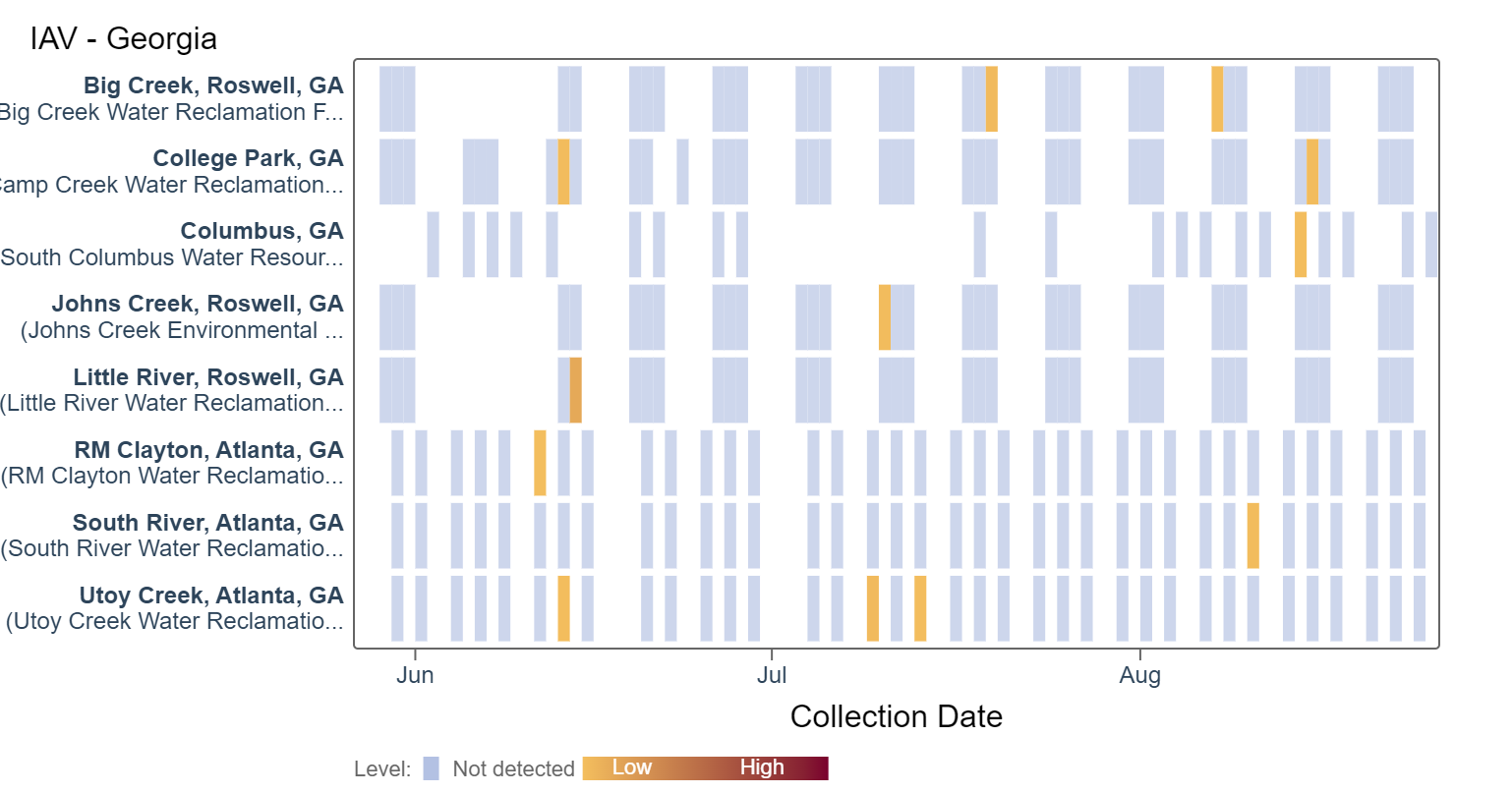 Influenza A (IAV) RNA was not detected at any of the Georgia sites in the last two weeks, according to the heat map below. An analysis of IAV RNA concentrations showed there is no trend across Georgia sites.
