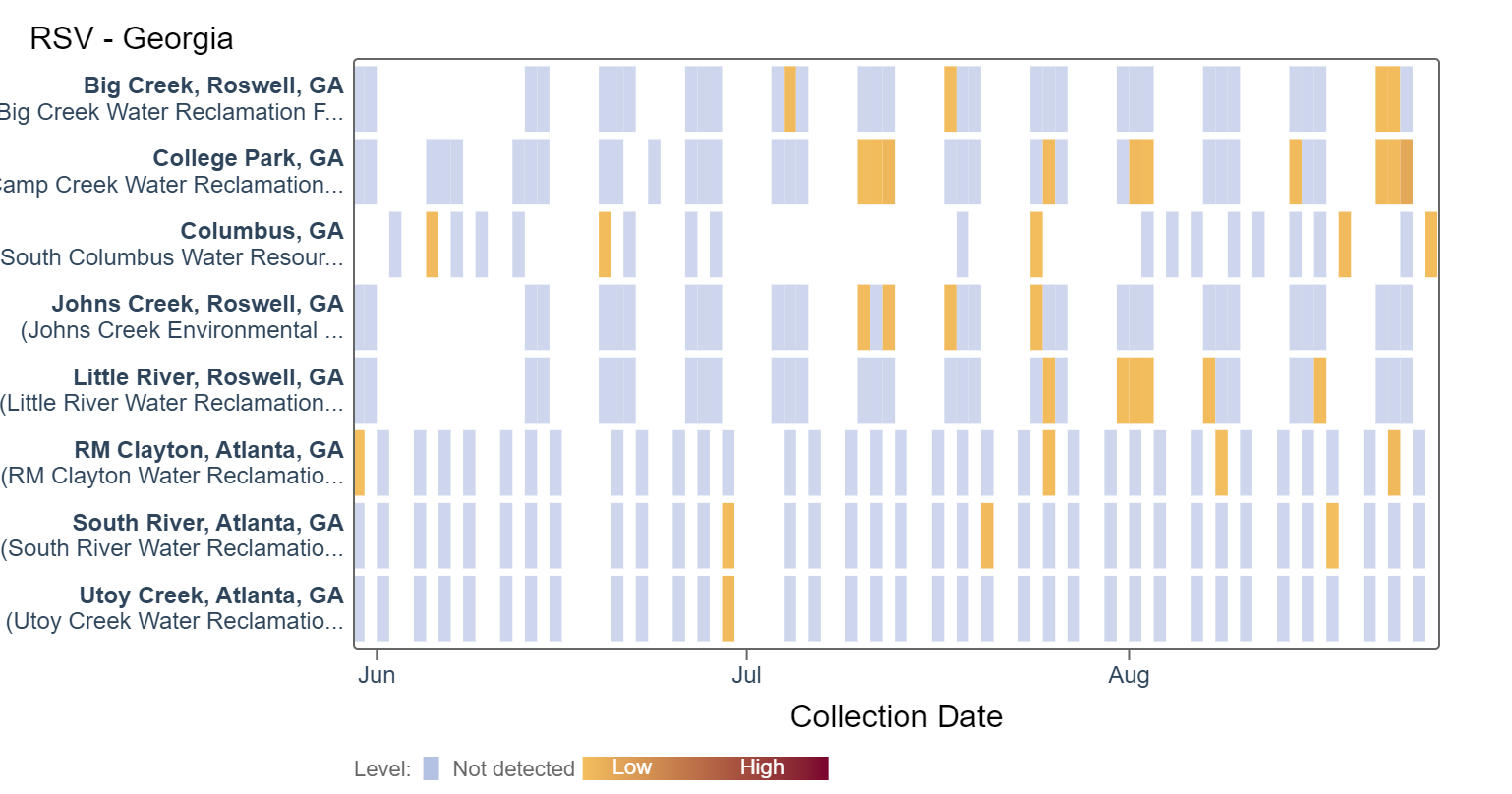 RSV RNA has been sporadically detected at lower concentrations at most of the Georgia sites. Concentrations are less than 7200 copies/g. An analysis of IAV RNA concentrations showed there is no trend at 5 Georgia sites and a significant upward trend at the Big Creek, College Park, and Johns Creek sites.