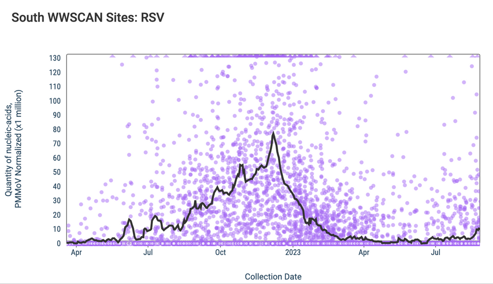 Below are the RSV RNA concentrations (normalized by PMMoV) from sites in the Southern US (AL, AR, DE, FL, GA, KY, MD, NC, TN, TX, VA, and WV). The population weighted average across regional WWSCAN plants is shown in black and raw data are shown as purple dots. It is evident that concentrations in the South are relatively high around the start of the year with very low levels and mostly non-detects presently observed.