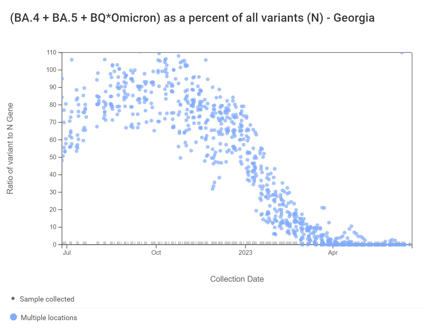 Early in 2023, WWSCAN started testing for XBB* and these results are available to view by selecting 'SARS-CoV-2 View by Variant' on data.wastewaterscan.org. For Georgia sites, data dates back to early February 2023. The ratio of the XBB* mutations/N across all Georgia plants is shown in the chart below. As the ratio reaches 100%, it suggests that all the SARS-CoV-2 genomes in wastewater have the XBB* mutations. These estimates have not changed much since our last update, and data indicate that the average ratio XBB* mutations/N is ~75% but has ranged from 40-100% recently. This suggests the majority of infections across the communities are caused by XBB*. The next chart below shows the ratio of the BA.5, BA.4, and BQ* mutation/N across all Georgia plants. It can be read the same way as the XBB* chart. The average ratio is close to 0%. Note that our XBB* assay will also detect XBB.1.16, XBB.1.9, and FD.2 (XBB.1.5.15.2*).