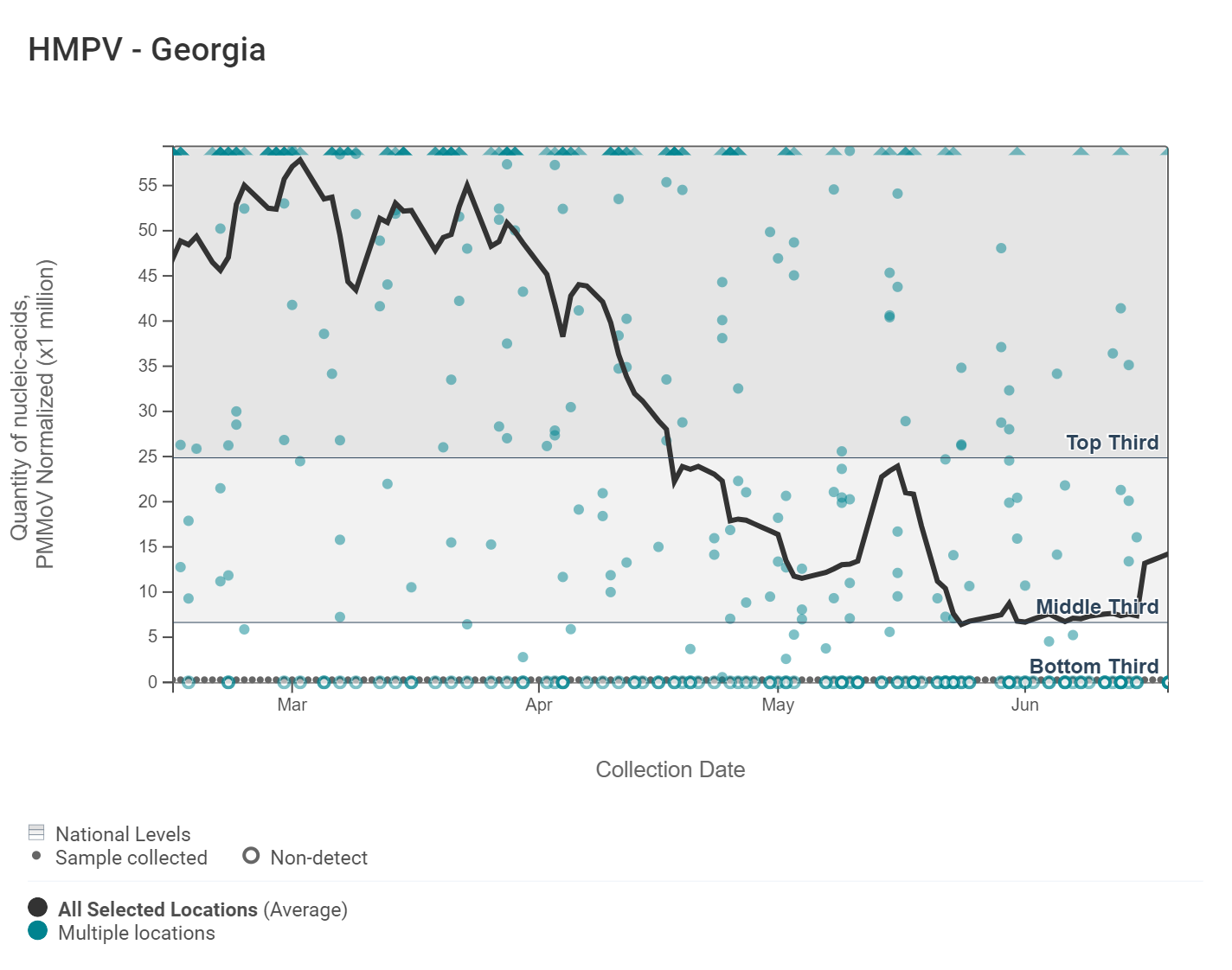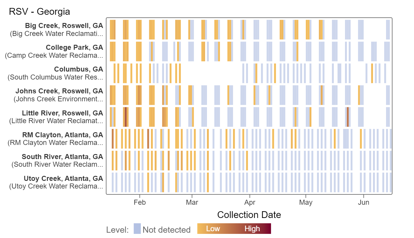 RSV RNA has not been detected in samples collected from Georgia sites over the last two weeks. Additionally, the analysis of RSV concentrations across the 8 Georgia sites shows no trend at all sites over the last 21 days.