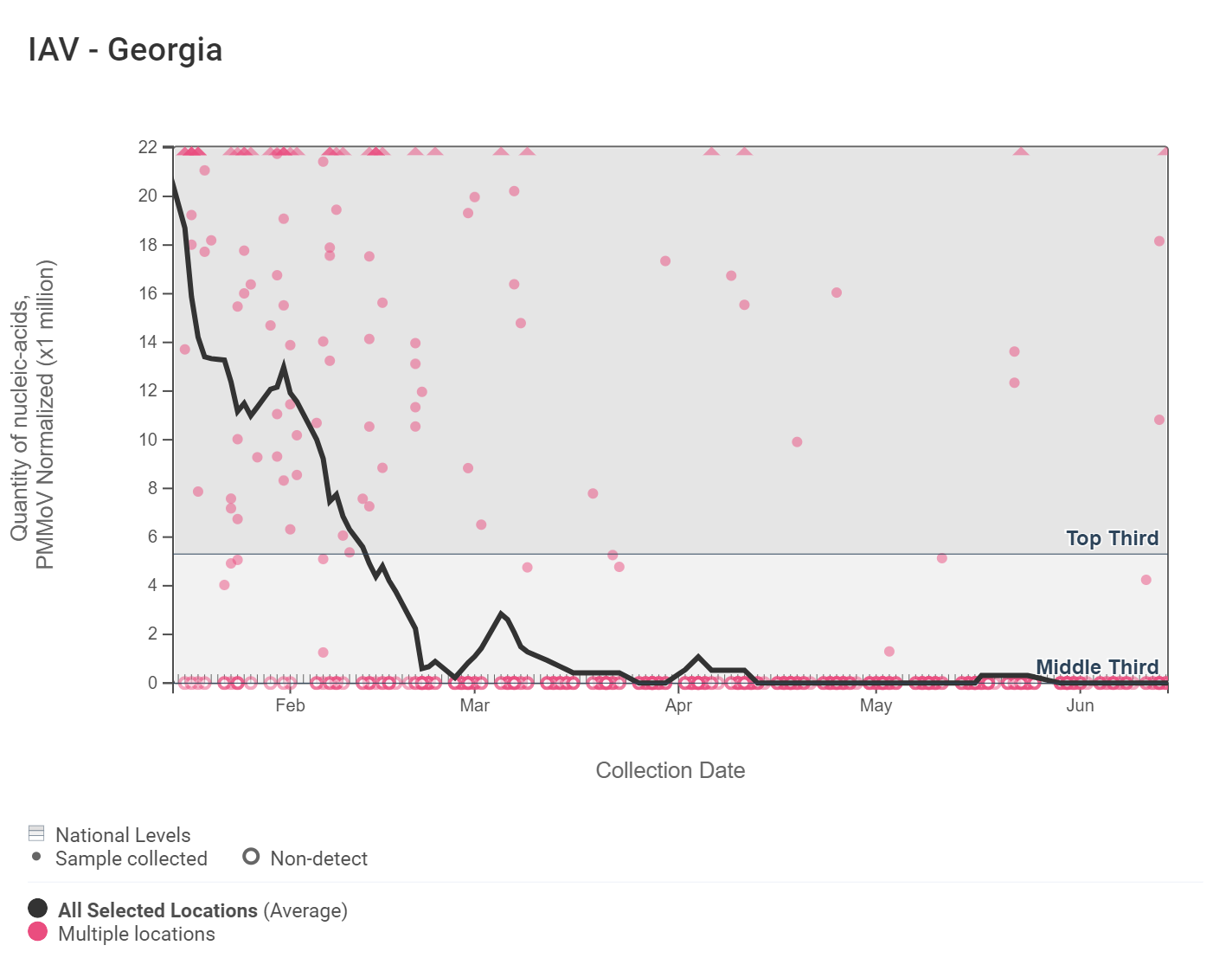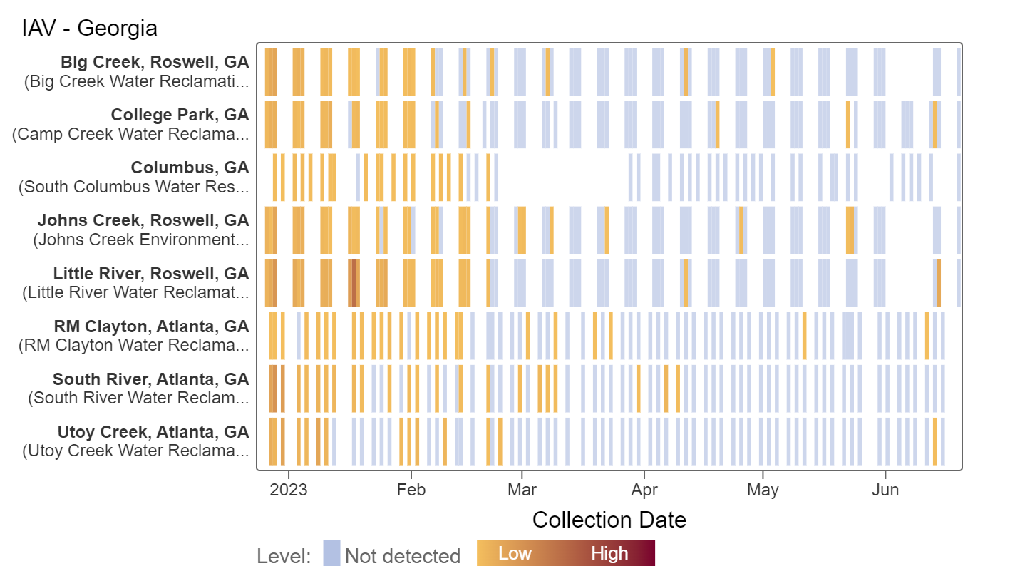Influenza A (IAV) RNA has sporadically been detected at various Georgia sites in samples collected over the last few months, according to the heat map below and there is no significant trend over the last 21 days at all sites.
