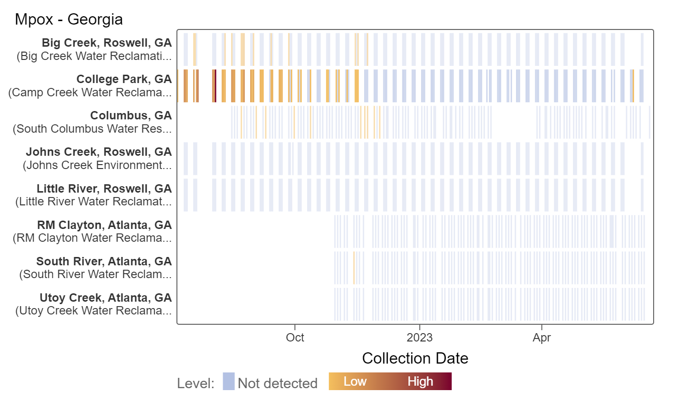 Results continue to remain non-detect for mpox at most Georgia plants. Earlier this month, there was a recent single detection in College Park at the Camp Creek Water Reclamation Facility. This heat map shows data since July 2022. Sites are labeled in the rows and each date a sample was collected as a column. The color blue means the sample was non-detect for mpox DNA and the colors get darker with higher concentrations.