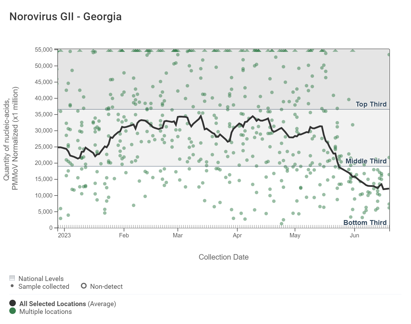 Norovirus GII (HuNoV GII) RNA concentrations have slightly decreased ranging from 2,000,000 - 8,000,000 copies per gram. The analysis of HuNoV GII concentrations across the 8 Georgia sites shows no trend at all sites over the last 21 days.
