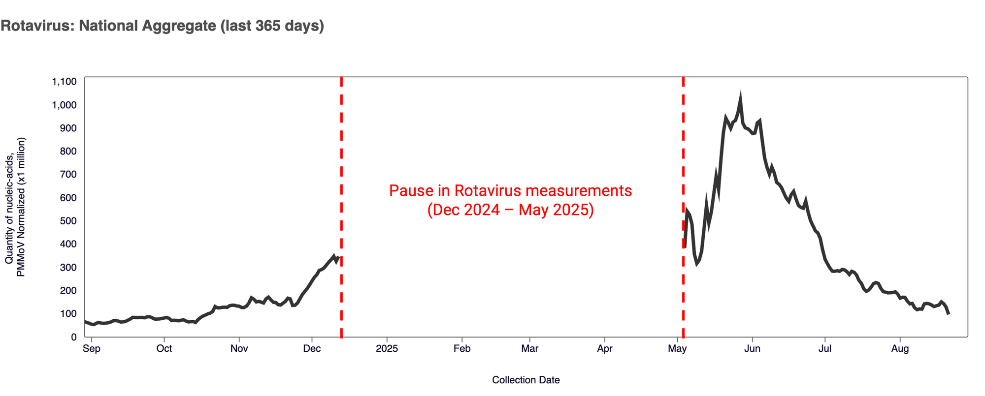 Rotavirus (Rota) RNA- In mid May 2025, we started measuring Rotavirus again. We previously paused measurements of Rota in December 2024 in order to being measuring Mpox clade Ib.