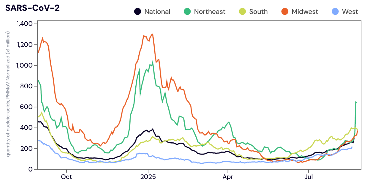 SARS-CoV-2 N gene RNA median concentration across all sites in past 3 weeks was 79,591 copies/gram. SARS-CoV-2 was detected in 98% of samples in August. The median SARS-CoV-2 concentration in August 2025 was up 93% compared to July 2025. We will continue to monitor closely as we move through the start of the school year into fall.