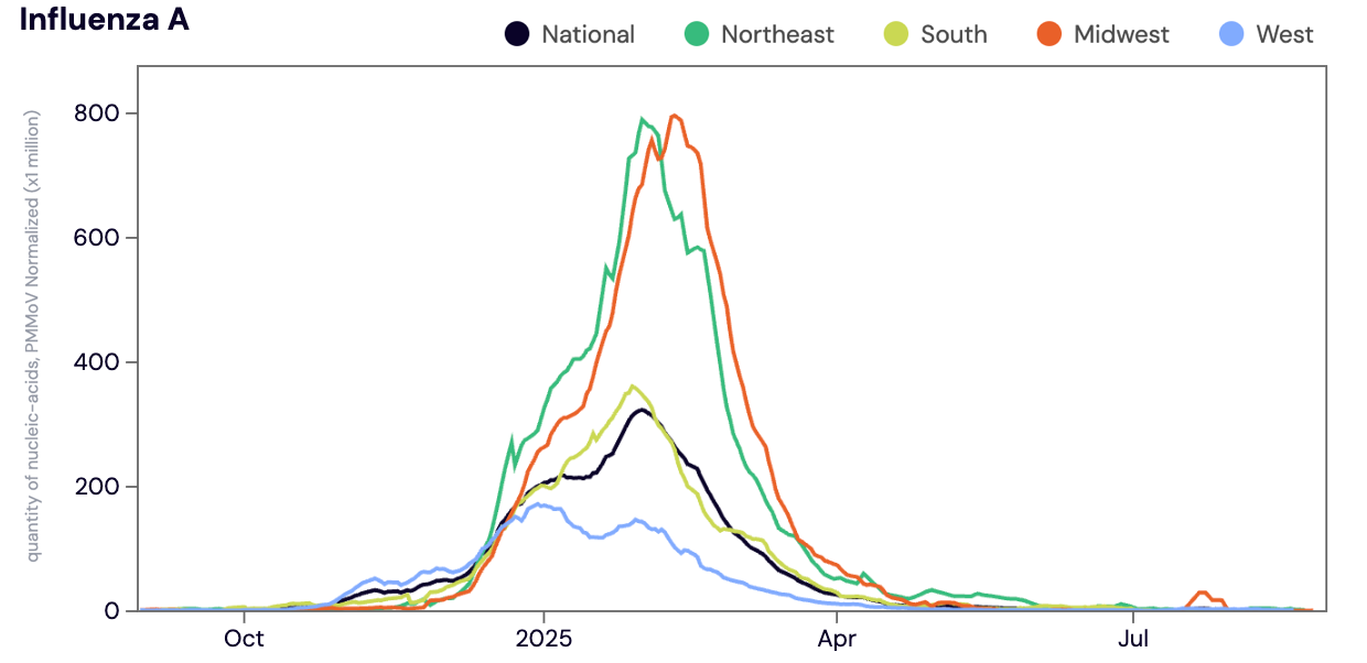 Influenza A (IAV) RNA was detected in ~16% of samples in August 2025. IAV RNA median concentration across all sites in the past 3 weeks was below the limit of detection. Recently we've seen elevated IAV concentrations at a handful of sites in the network (mainly in AK and CA). We will continue to monitor as we move into respiratory virus season this fall/winter.