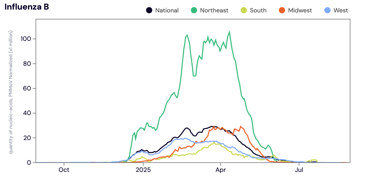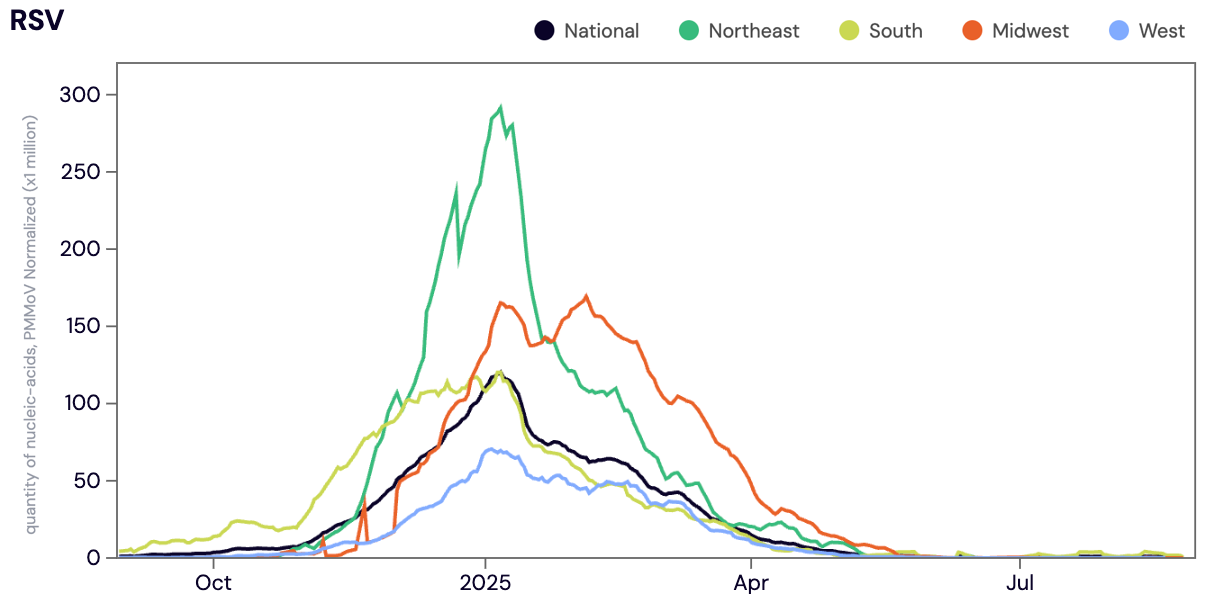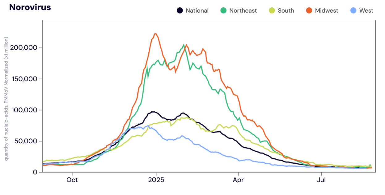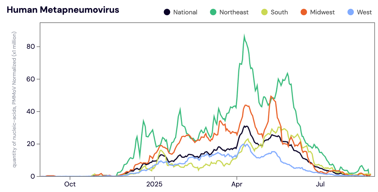 Measles (MeV) RNA - In mid-May 2025, we began prospectively monitoring for MeV. In August 2025, there were 6 positive detections of MeV in wastewater samples (1 in GA, 1 in ID, 3 in MI, and 1 in NV). Nationally, MeV is in the 'LOW' category due to limited detections.