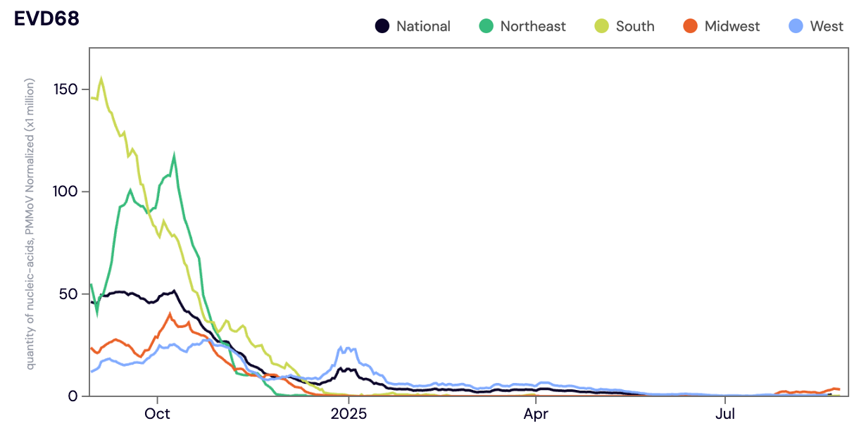 Enterovirus D68 (EV-D68) RNA was detected in ~10% of samples collected in August 2025. The median concentration across all sites was below the limit of detection in the last 3 weeks. Below is the population-weighted average EV-D68 RNA(normalized by PMMoV) shown in black from all participating WWSCAN sites across the country over the last 365 days.