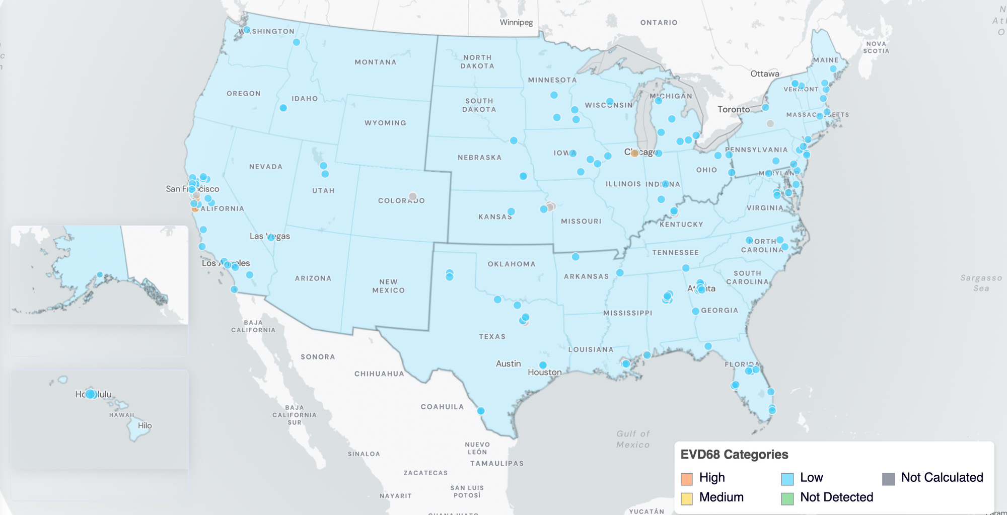 Nationally, EV-D68 is in the 'LOW' Wastewater Category with >50% of sites in seasonal offset of HMPV in wastewater.