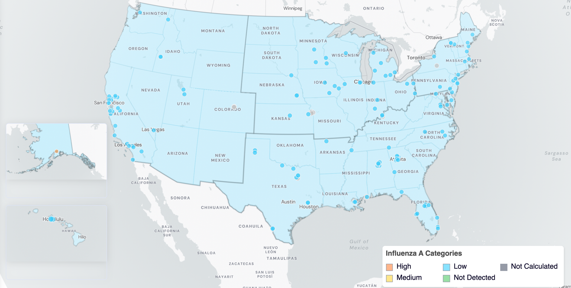 Nationally, Influenza A is in the 'LOW' Wastewater Category with >50% of sites in seasonal offset of IAV in wastewater.