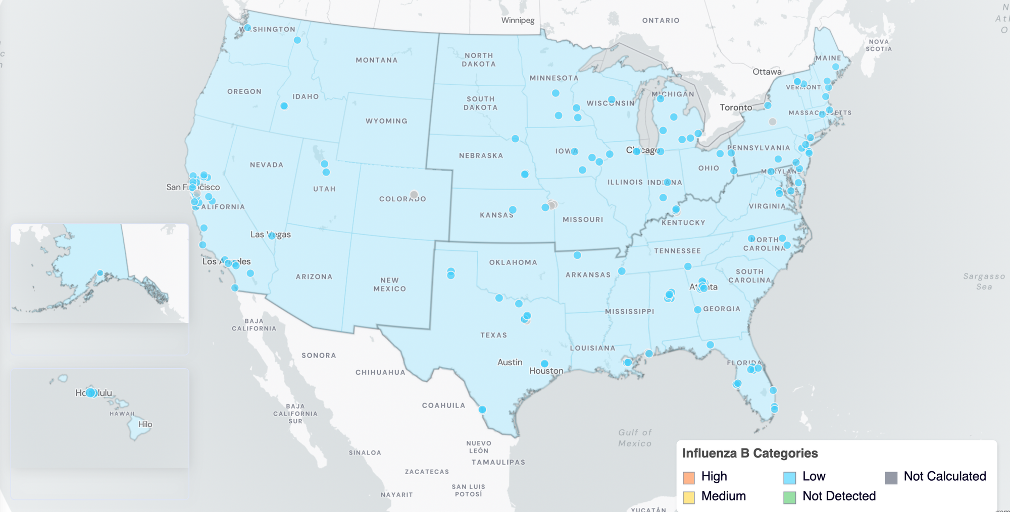 Nationally, Influenza B is in the 'LOW' Wastewater Category with with all sites in seasonal offset for IBV in wastewater.