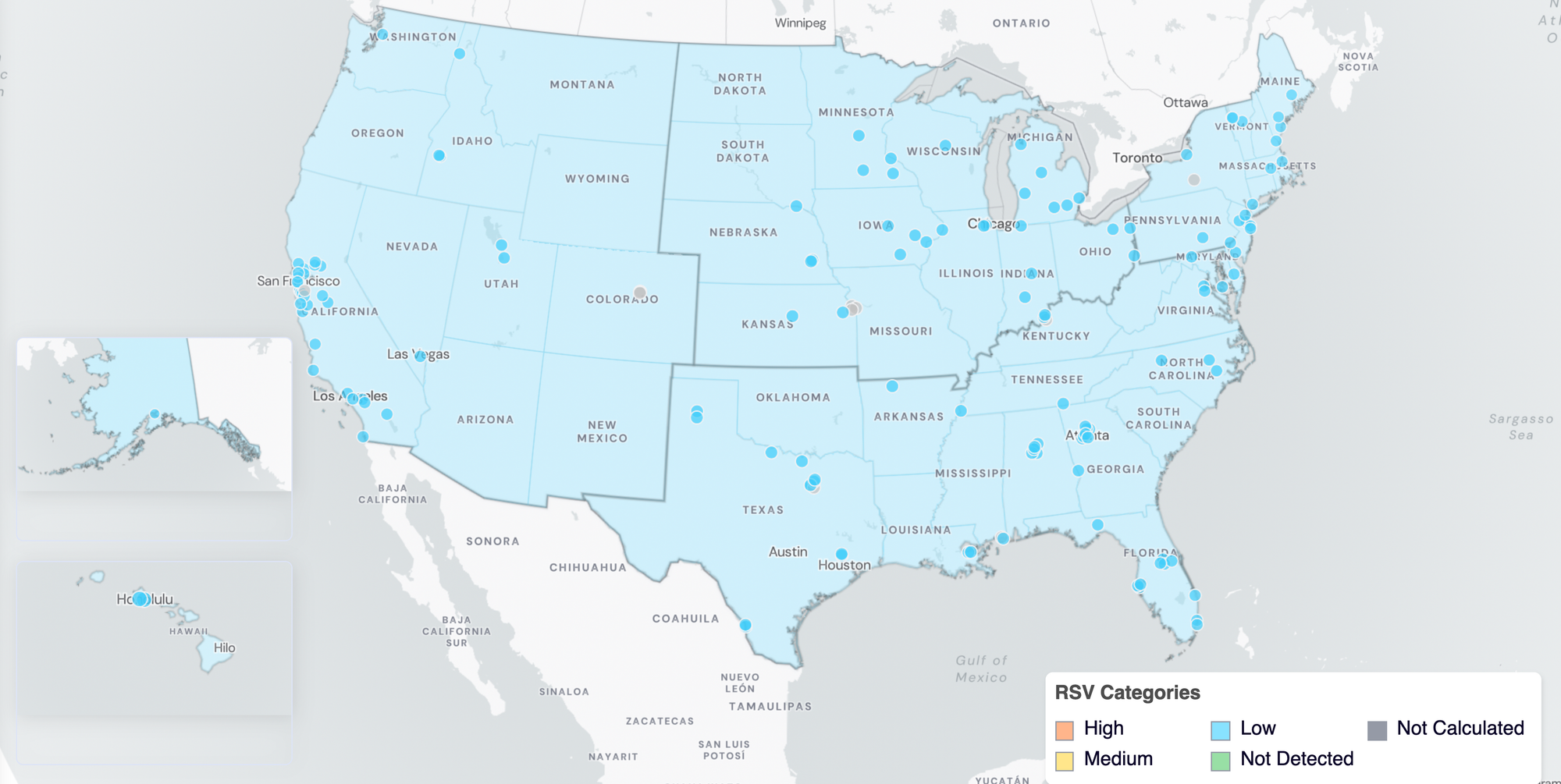 Nationally, RSV is in the 'LOW' Wastewater Category with all sites in seasonal offset for RSV in wastewater.