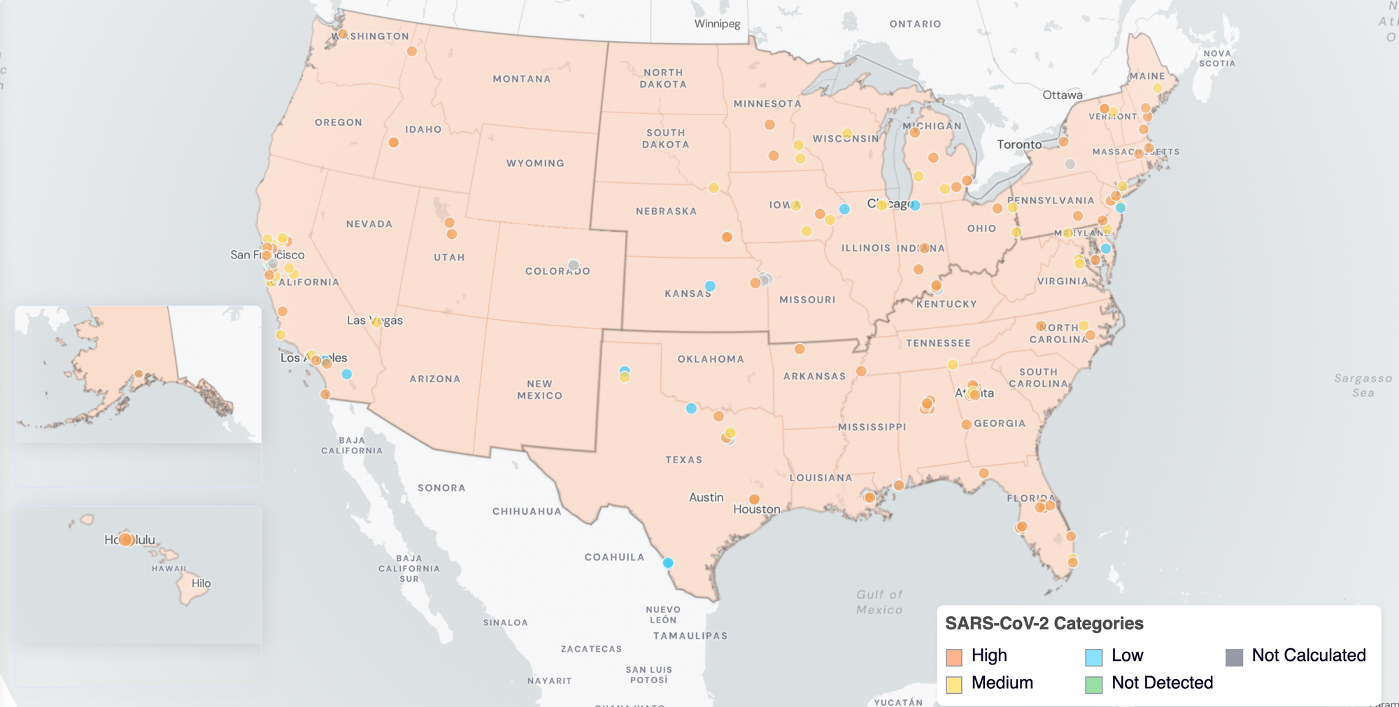Nationally, SARS-CoV-2 is in the 'HIGH' category with aggregated measurements showing high concentrations and an upward trend over the last 3 weeks.