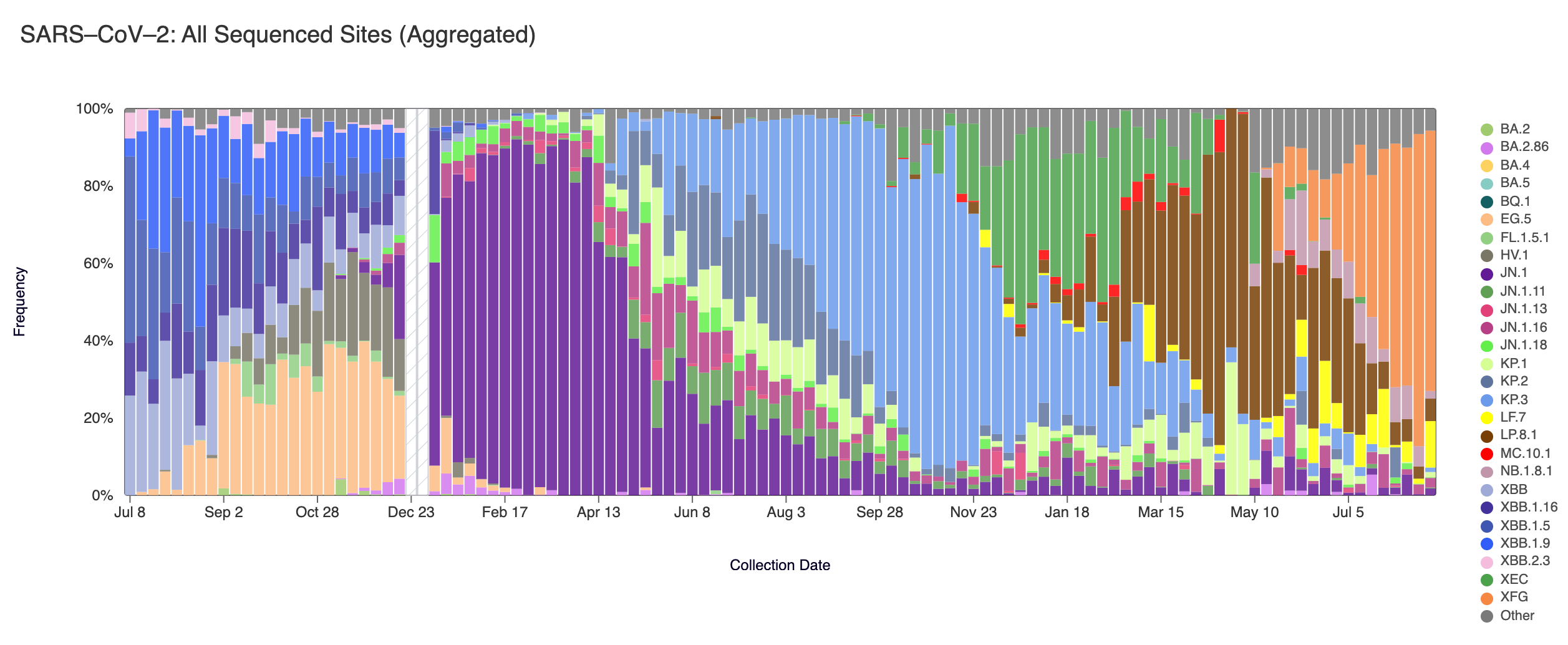 Sequencing data is also available in aggregate across all sites in WWSCAN with sequencing data. That plot is shown below and also suggests that XFG (shown in orange) is the most abundant variant across all sites at 67.3%, followed by LF.7 (shown in yellow) is at 12%.