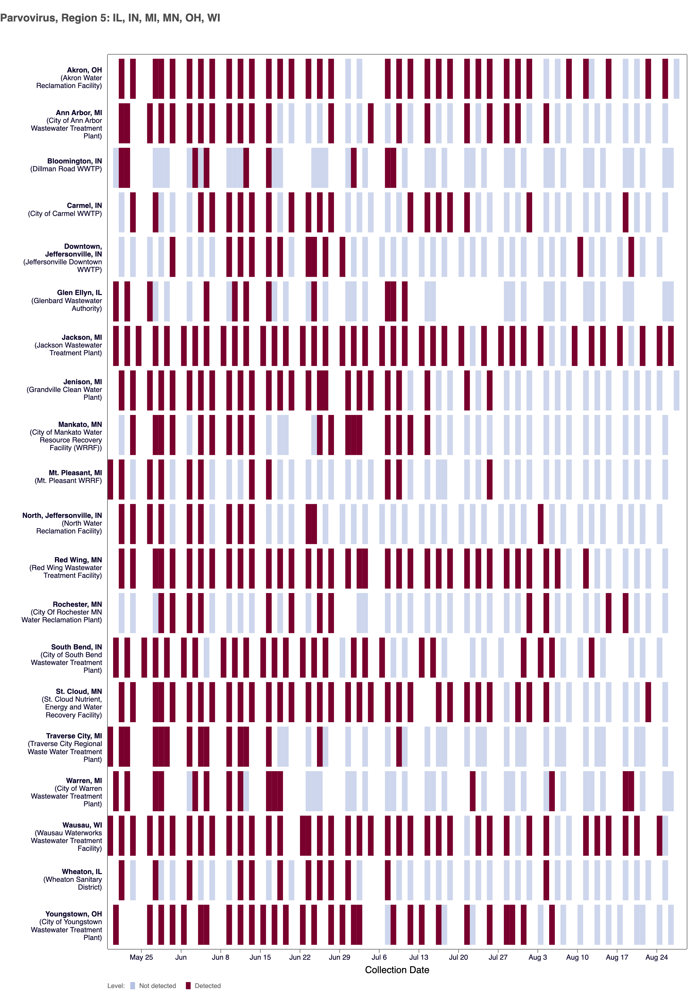 As a reminder, we are not currently calculating wastewater categories for Parvovirus. In order to calculate wastewater categories we need a longer time series of data to examine trends and levels.