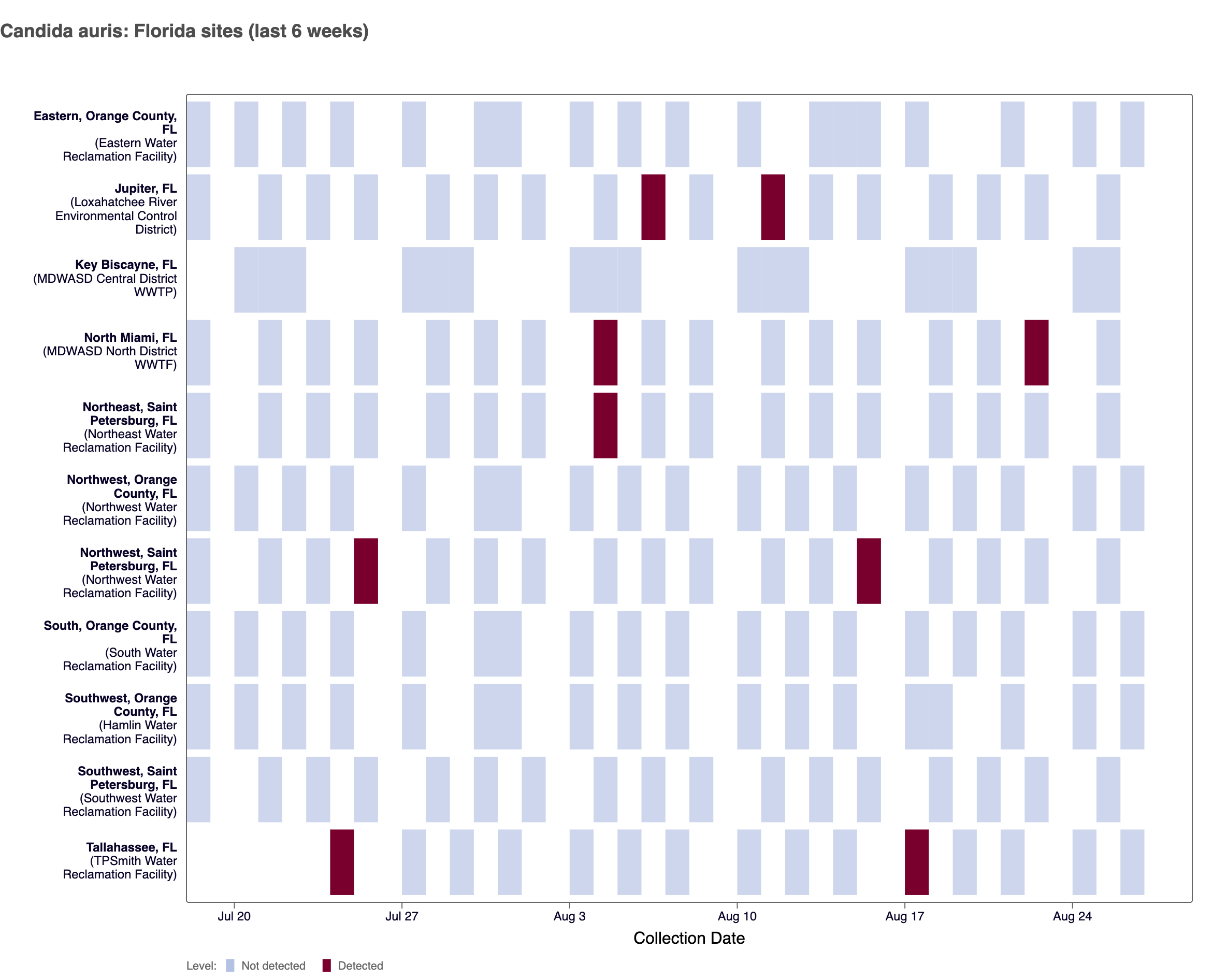 The chart below shows plants in Florida as rows, and days as columns (labeled at the bottom axis). White indicates no samples, blue is non-detect for C. auris DNA and red is detect for C. auris DNA.