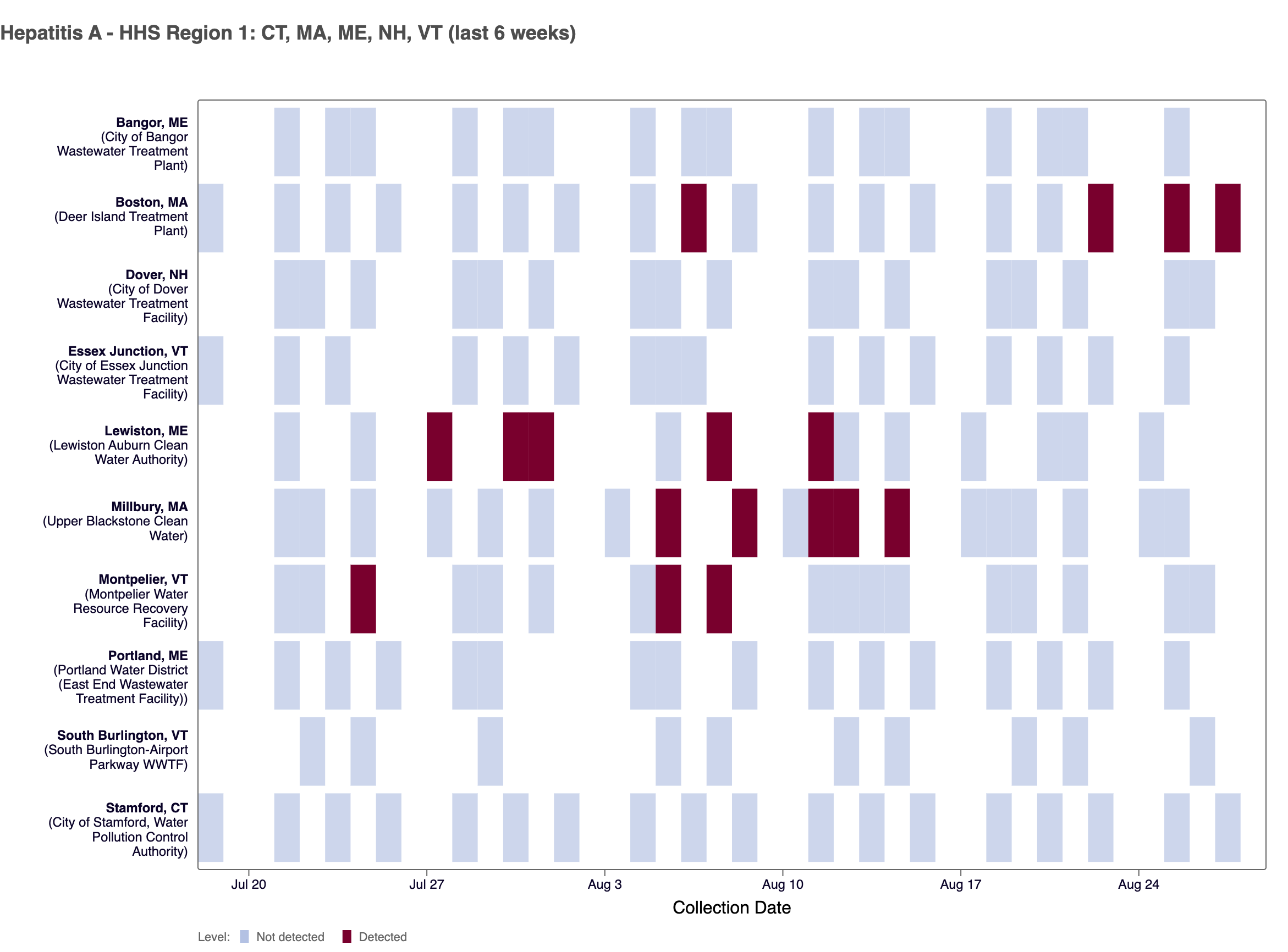 The chart below shows each WWSCAN plant in HHS Region 1 as rows, and days as columns (labeled at the bottom axis). White indicates no samples, blue is a non-detect for Hep A RNA and red is a detection for Hep A RNA.