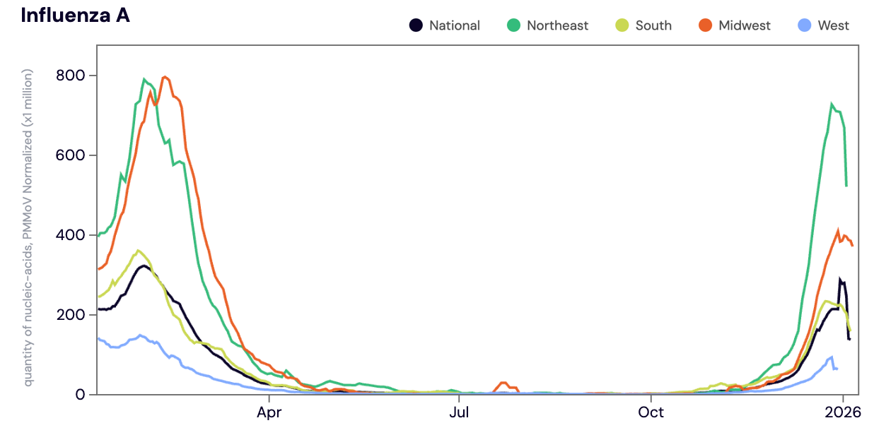 West Nile Virus RNA - In mid October 2025, WWSCAN began prospective monitoring for West Nile Virus (WNV). There was 1 positive detection of WNV in December 2025 (1 in IA) Nationally, WNV in the 'NOT-DETECTED' category due to no recent detections.