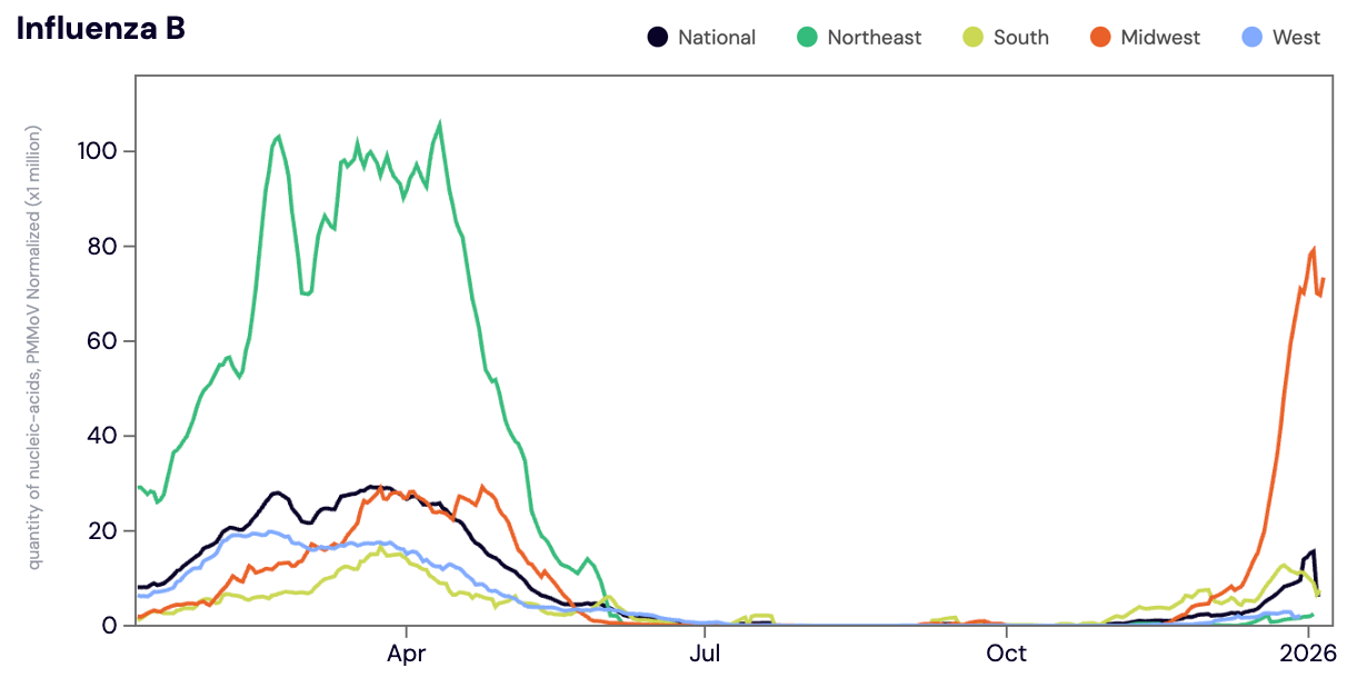 Influenza A (IAV) RNA was detected in 90% of samples in December 2025. The median IAV RNA concentration across all sites in December 2025 was 24,667 copies/gram. The median IAV concentration in December 2025 was up ~1,000% compared to November 2025. All regions hit the threshold for seasonal onset in mid to late December 2025. As a reminder, during last years respiratory virus season (2024-2025) the WWSCAN network hit seasonal onset for IAV in mid December 2024.