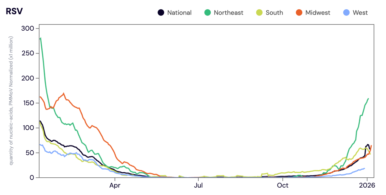 Respiratory syncytial virus (RSV) RNA was detected in ~69% of samples in December 2025. The RSV RNA median concentration across all sites in December 2025 was 7,148 copies per gram. As a reminder, during last years respiratory virus season the WWSCAN network hit seasonal onset for RSV in early December 2024 and peaked in early January 2025. We are currently seeing a slower start to the RSV wastewater wave this year (2025-2026) compared to last year (2024-2025).