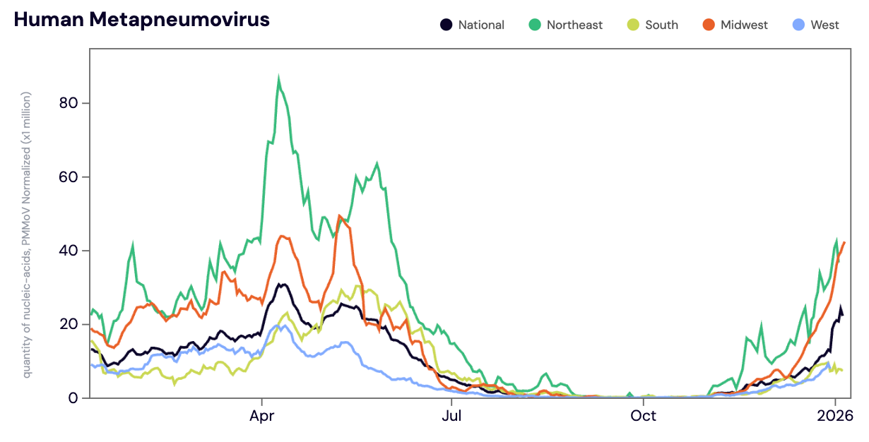 HMPV (human metapneumovirus) RNA was detected in ~42% of samples in December 2025. The median HMPV RNA concentrations across all sites in December 2025 was below the limit of detection. HMPV concentrations have been steadily increasing across all regions since late December 2025.