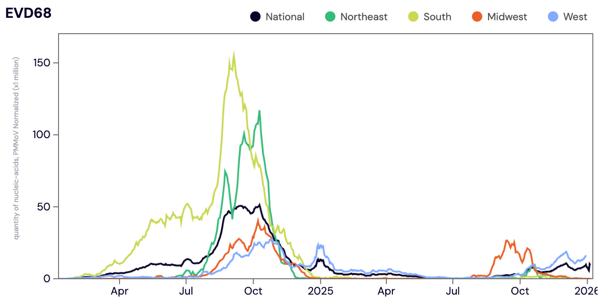 Enterovirus D68 (EV-D68) RNA was detected in ~28% of samples collected in December 2025 (with most positive detections in California). The median concentration across all sites in December 2025 was below the limit of detection.