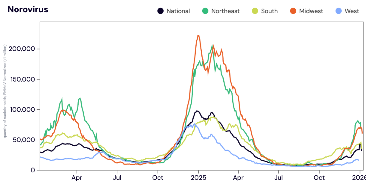 Norovirus GII (HuNoV GII) RNA was detected in 100% of samples analyzed in December 2025. The median Norovirus concentration in December 2025 was up ~71% compared to November 2025. Last year, we saw Norovirus concentrations start to increase in early October 2024 and peak early February 2025. While we are seeing a slower start to the winter Norovirus wave this year (2025-2026), but concentrations are continuing to increase.