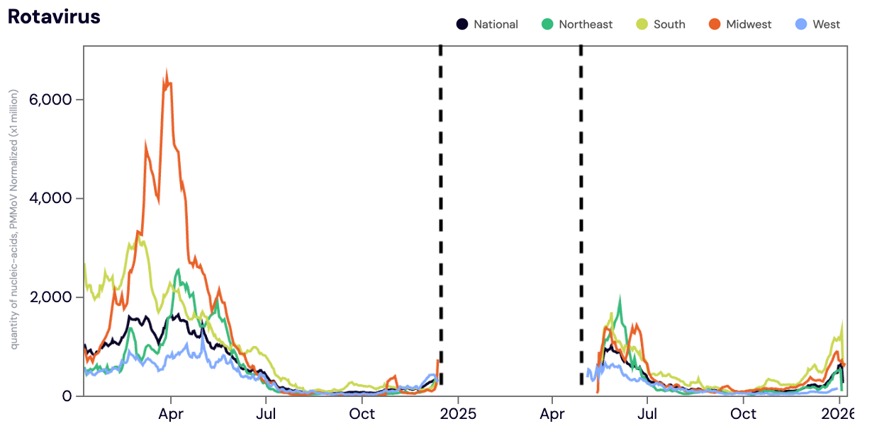 Rotavirus (Rota) RNA- In mid May 2025, we started measuring Rotavirus again. We previously paused measurements of Rota in December 2024 in order to being measuring Mpox clade Ib.