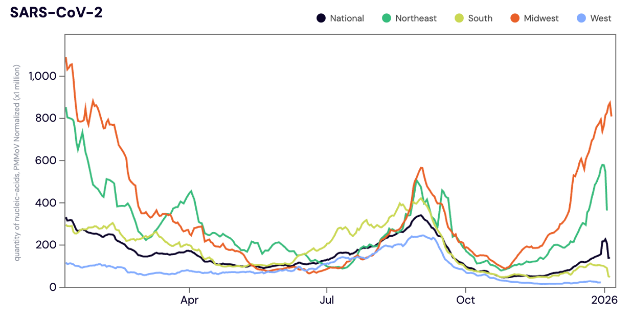 SARS-CoV-2 N gene RNA was detected in ~88% of samples in December 2025. The median SARS-CoV-2 concentration across all sites in December 2025 was 22,531 copies/gram. The median SARS-CoV-2 concentration in December 2025 was up ~82% compared to November 2025. While SARS-CoV-2 concentrations are low in the West, we are seeing elevated concentrations across the Midwest and Northeast regions. We will continue to monitor these trends as we move through the winter months.
