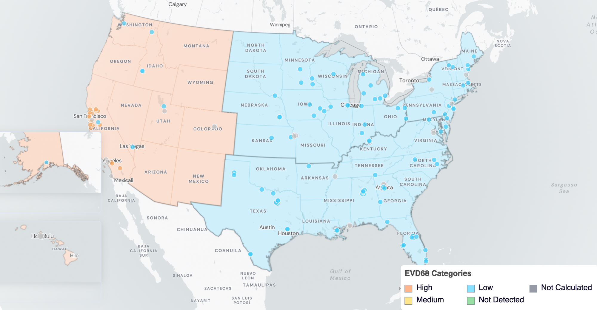 Nationally, EV-D68 is in the 'LOW' Wastewater Category with >50% of sites in offset of EV-D68 in wastewater. However the West is in the 'HIGH' category due to >50% of sites in onset, all of which are in California.
