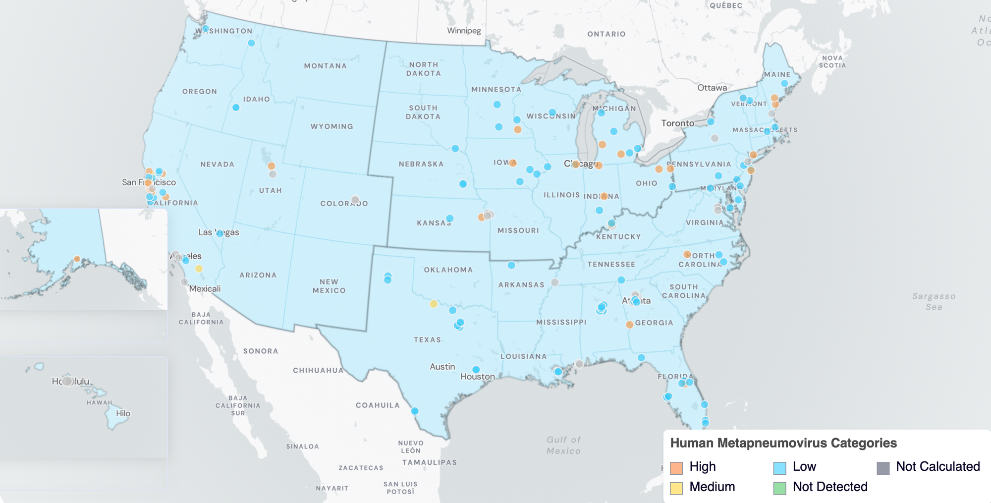 Nationally, HMPV is in the 'LOW' Wastewater Category with most sites in seasonal offset for HMPV in wastewater.