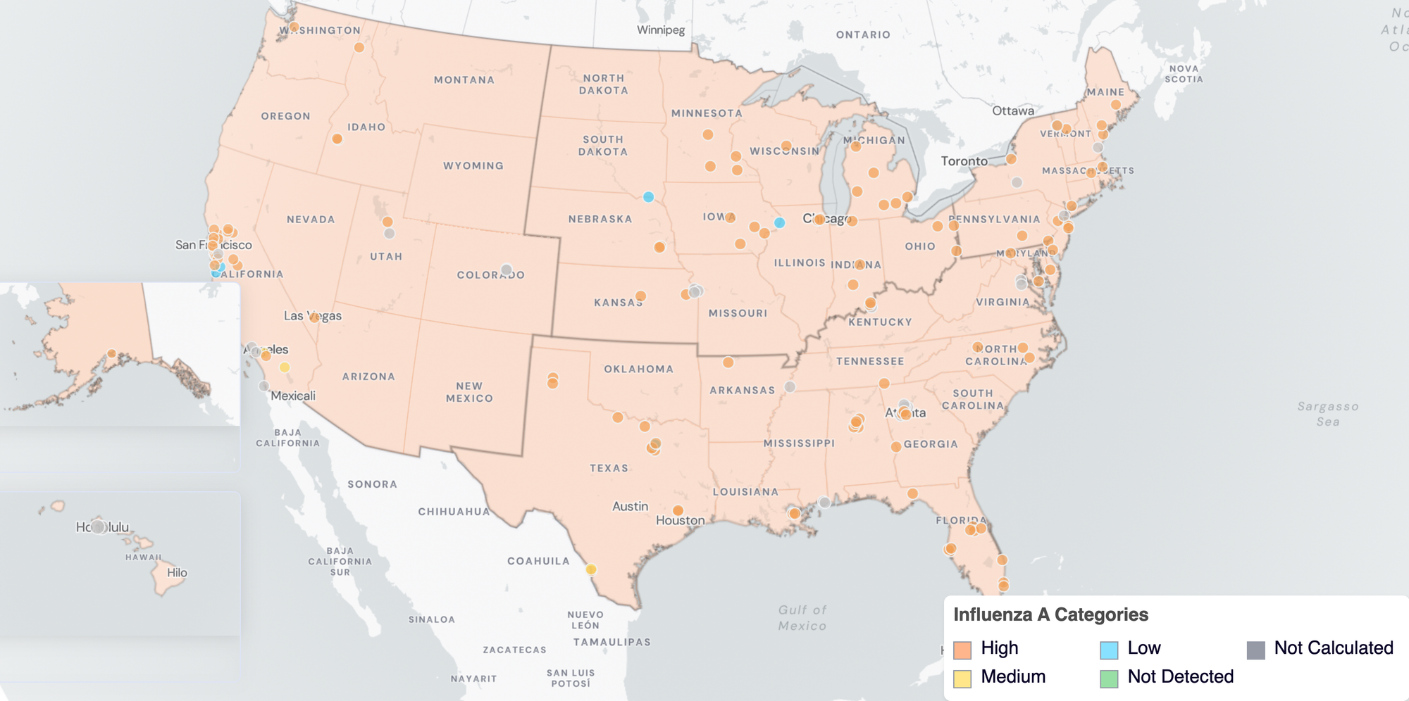 Nationally, Influenza A is in the 'HIGH' Wastewater Category with >50% of sites in seasonal onset for IAV in wastewater. We are seeing high concentrations and an upward trend for IAV in wastewater at the national level.