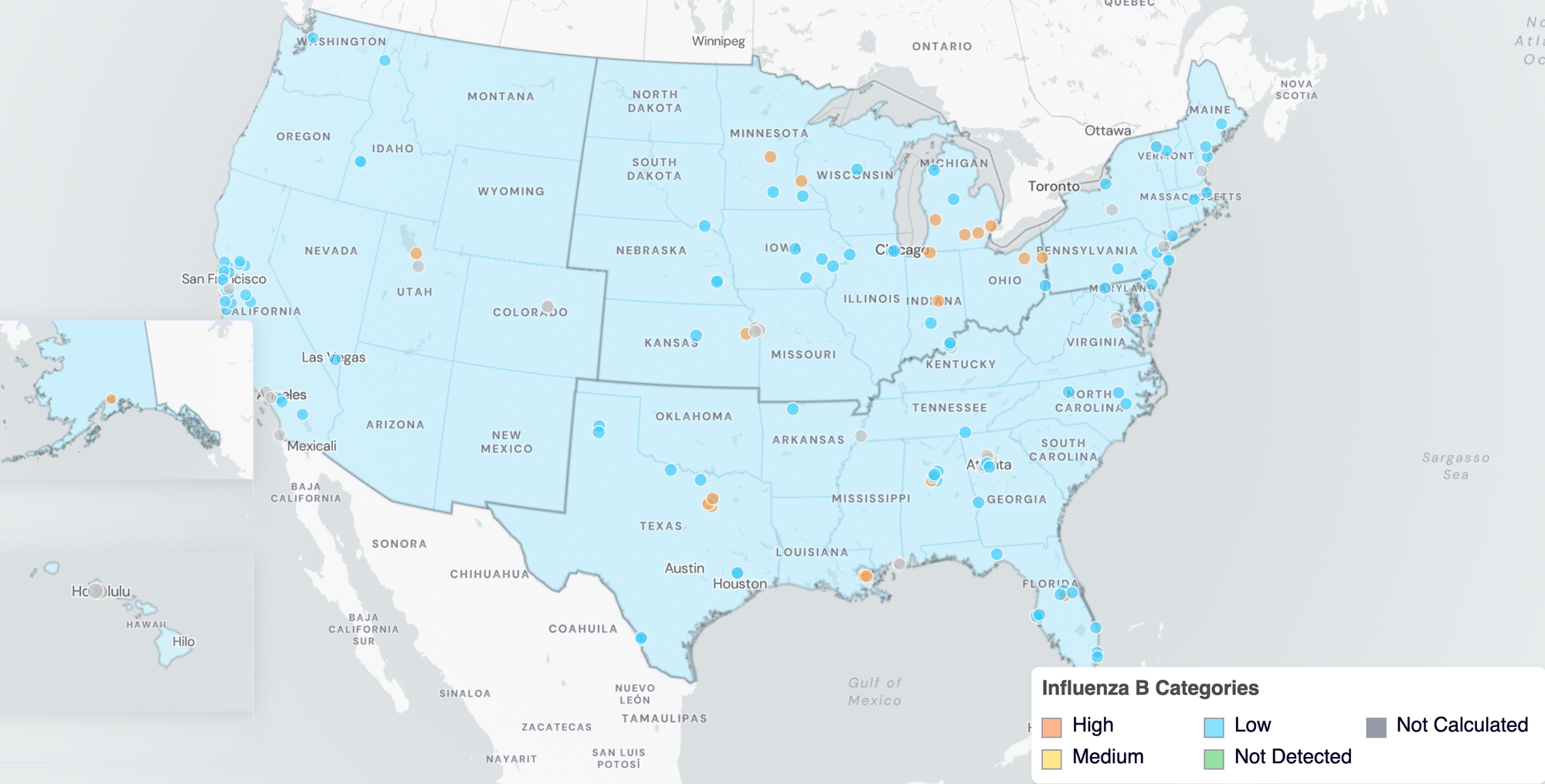 Nationally, Influenza B is in the 'LOW' Wastewater Category due to >50% of sites being in offset for IBV in wastewater.