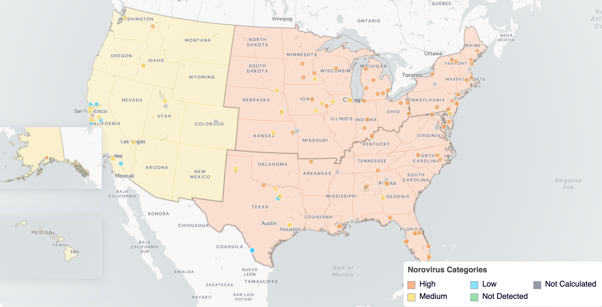 Norovirus Wastewater Categories. This map includes sample collection data through December 31, 2025. Each dot represents a single site and the four US Census regions are outlined in gray. Midwest Region includes: IA, IL, IN, KS, MI, MN, NE, OH, SD, WI. Northeast Region includes: CT, MA, ME, NH, NJ, NY, PA, VT. Southern Region includes: AL, AR, DE, FL, GA, KY, LA, MD, MS, NC, TN, TX, VA, and WV. Western Region includes: AK, CA, CO, HI, ID, NV, UT, WA.
