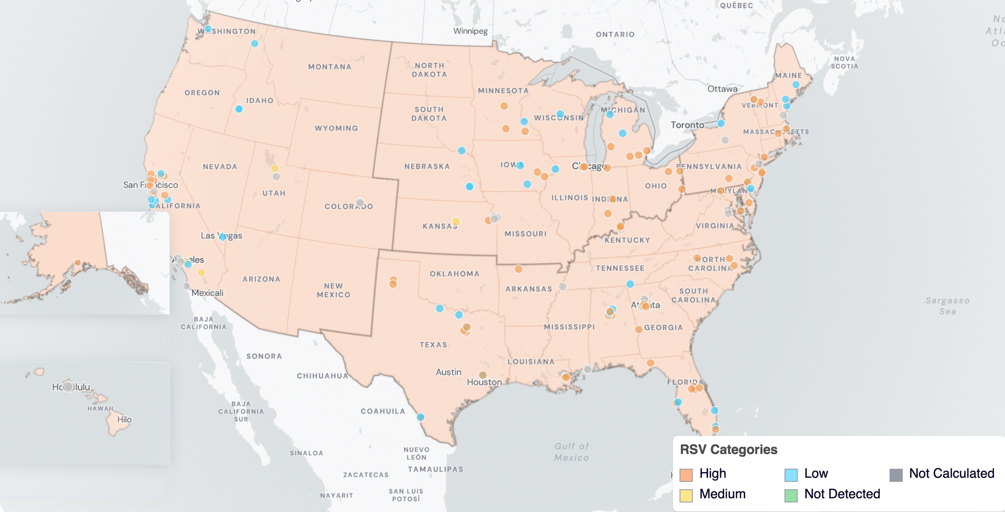 Nationally, RSV is in the 'HIGH' Wastewater Category with >50% of sites in seasonal onset for RSV in wastewater. We are seeing high concentrations and an upward trend for RSV in wastewater at the national level.