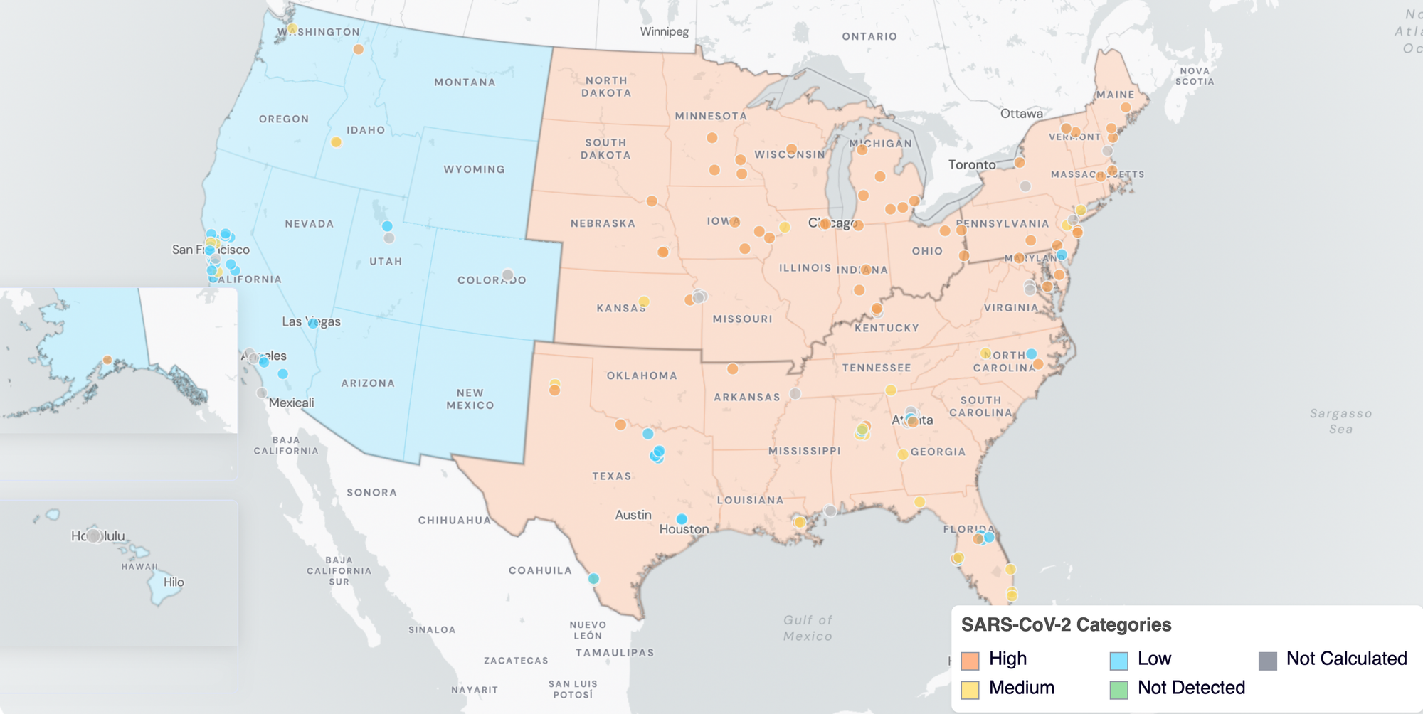 SARS-CoV-2 Wastewater Categories. This map includes sample collection data through December 31, 2025. Each dot represents a single site and the four US Census regions are outlined in gray. Midwest Region includes: IA, IL, IN, KS, MI, MN, NE, OH, SD, WI. Northeast Region includes: CT, MA, ME, NH, NJ, NY, PA, VT. Southern Region includes: AL, AR, DE, FL, GA, KY, LA, MD, MS, NC, TN, TX, VA, and WV. Western Region includes: AK, CA, CO, HI, ID, NV, UT, WA.