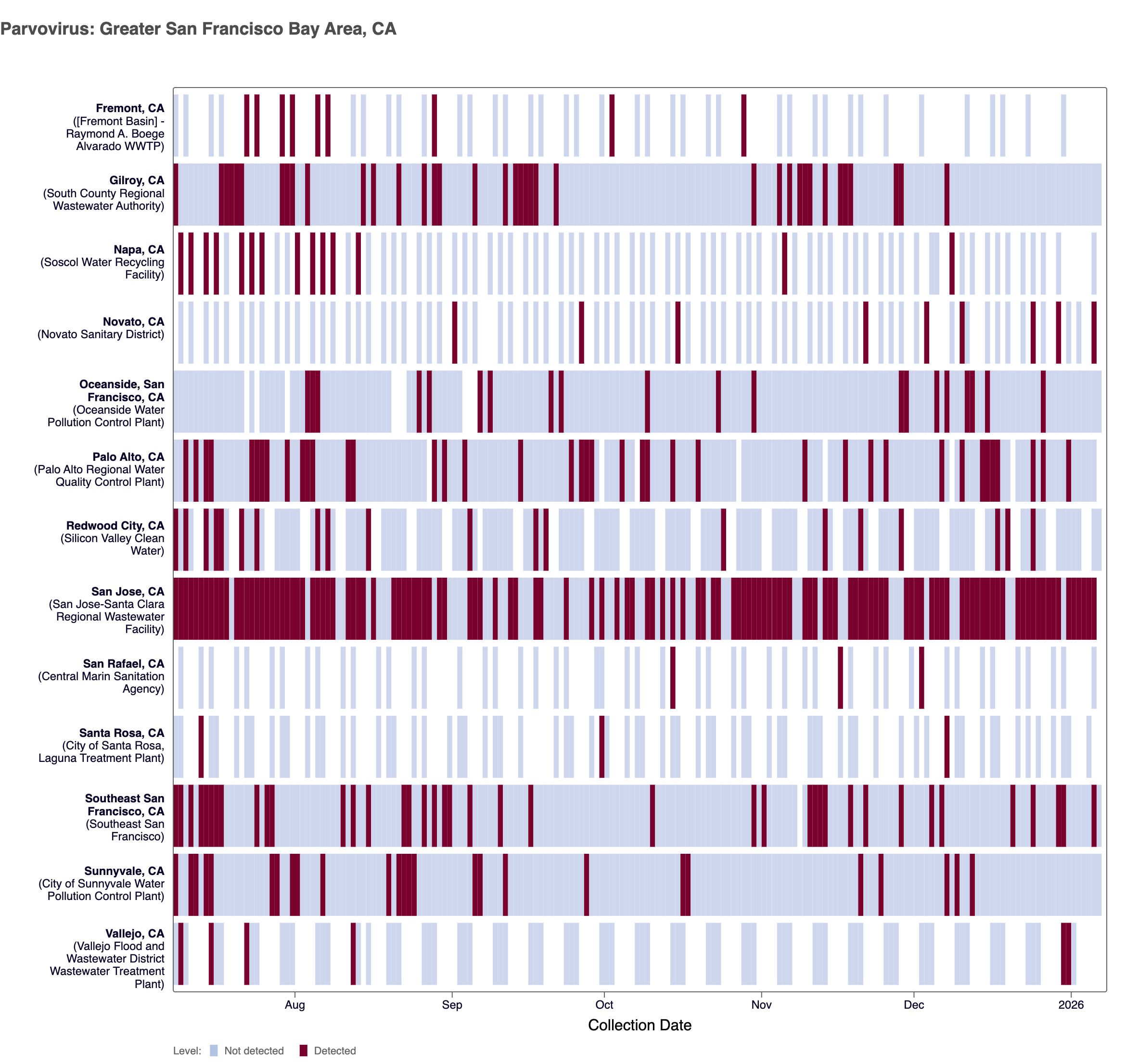 Parvovirus (Parvo) DNA - In mid May 2025, WWSCAN began prospectively monitoring for Parvovirus. Parvovirus B19 DNA was detected in ~27% of samples collected in December 2025 across WWSCAN sites.