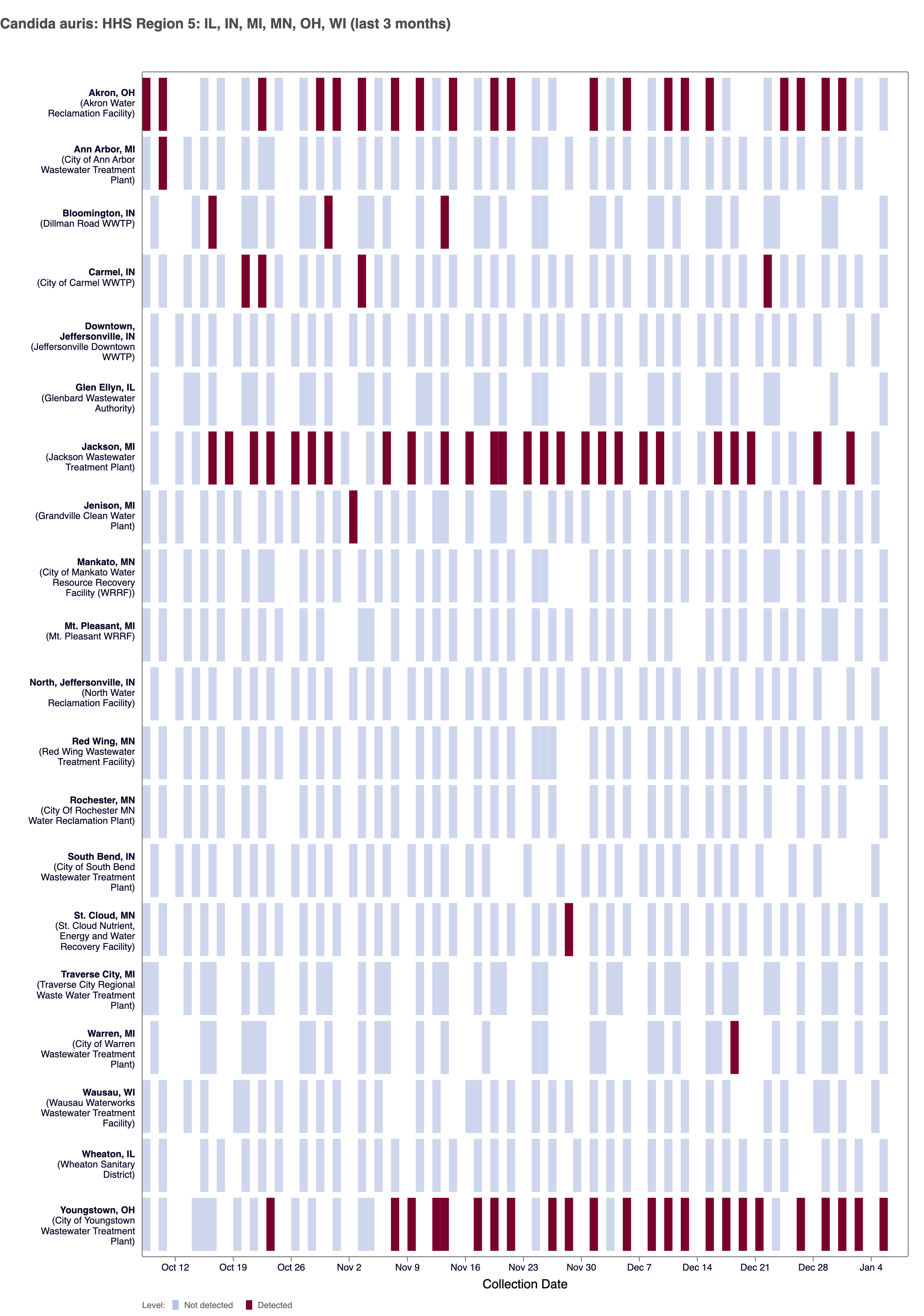 The chart below shows plants in HHS Region 5 (Midwest) as rows, and days as columns (labeled at the bottom axis). White indicates no samples, blue is non-detect for C. auris DNA and red is detect for C. auris DNA.