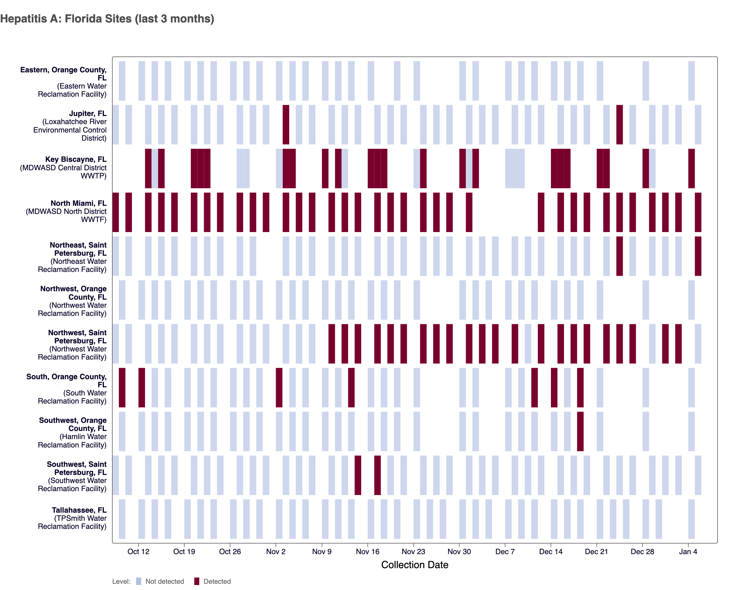 The chart below shows each WWSCAN plant in Florida as rows, and days as columns (labeled at the bottom axis). White indicates no samples, blue is a non-detect for Hep A RNA and red is a detection for Hep A RNA.