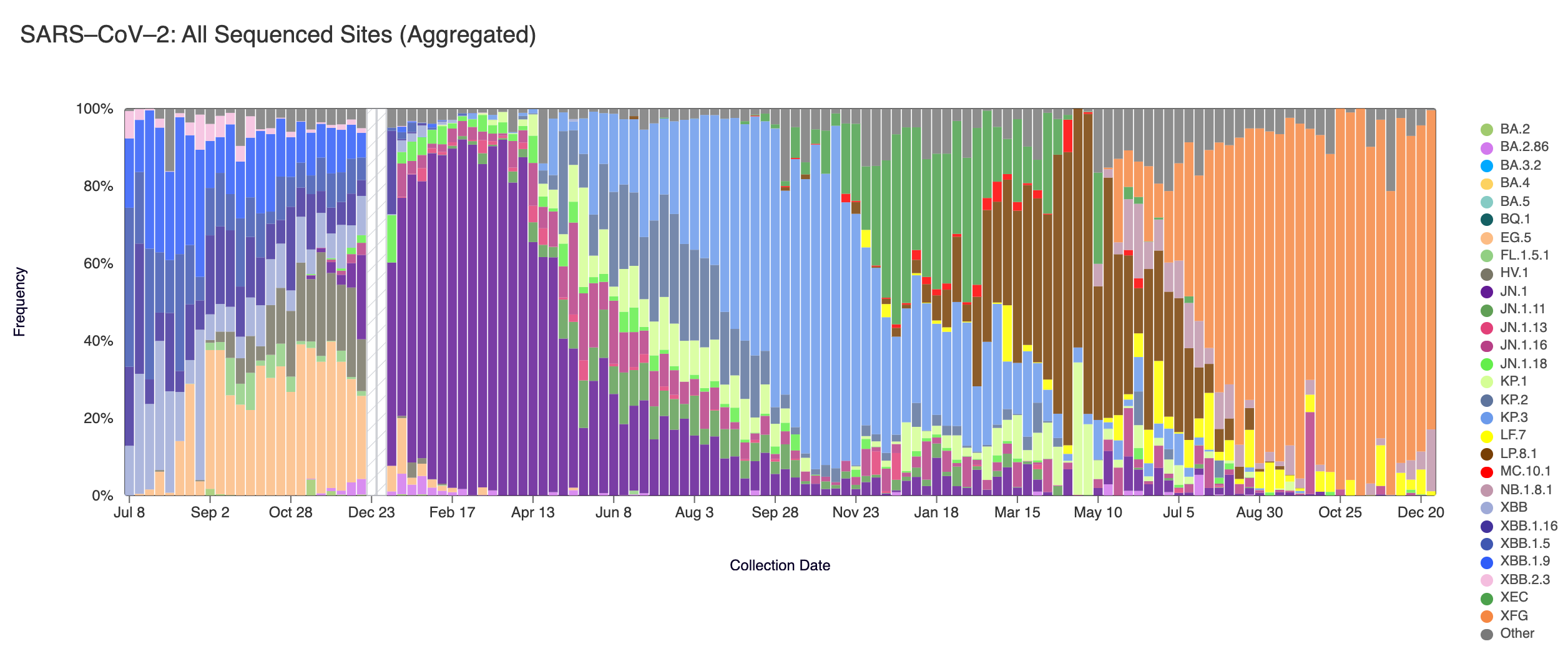 Sequencing data is also available in aggregate across all sites in WWSCAN with sequencing data. That plot is shown below and also suggests that XFG (shown in orange) is the most abundant variant across all sites at 82.5% followed by NB.1.8.1 (shown in mauve) at 16%.