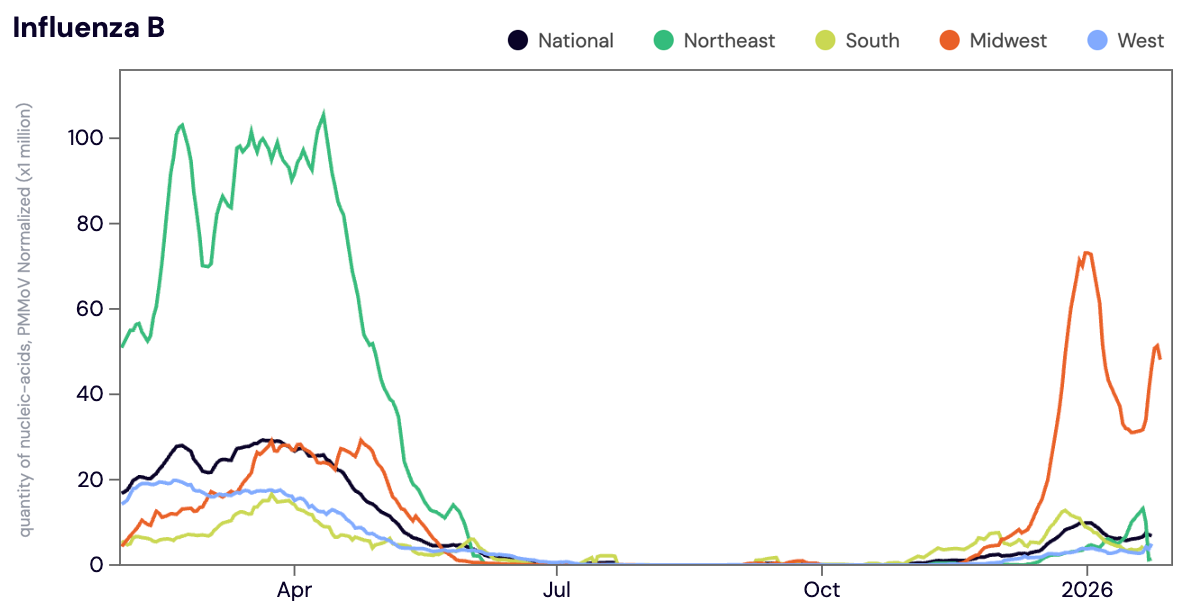 Influenza B (IBV) RNA was detected in ~41% of samples in January 2026. IBV RNA median concentration across all sites in January 2026 was below the limit of detection. Concentrations of IBV have been elevated in sites across the Midwest since early December 2025. As a reminder, during last years respiratory virus season (2024-2025) the national WWSCAN network did not hit seasonal onset for IBV until early March 2025.
