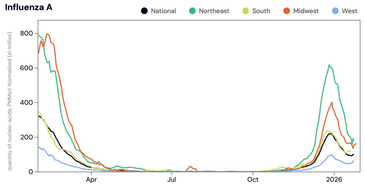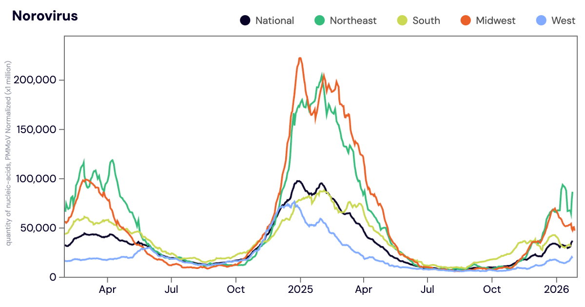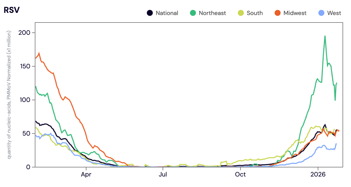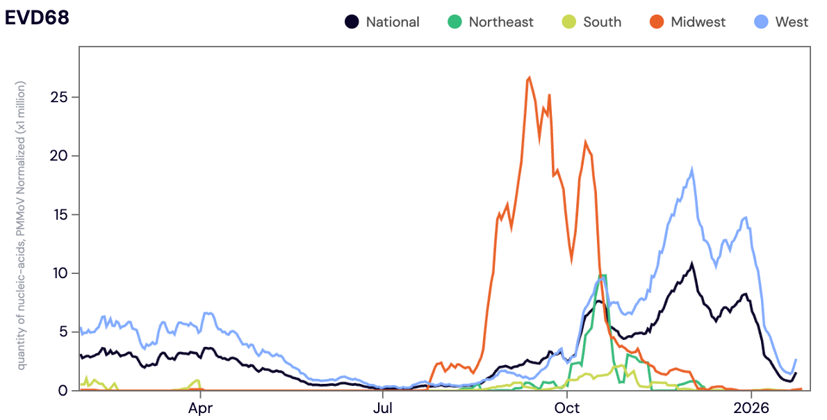 Enterovirus D68 (EV-D68) RNA was detected in ~20% of samples collected in January 2026 (with most positive detections in California). The median concentration across all sites in January 2026 was below the limit of detection.