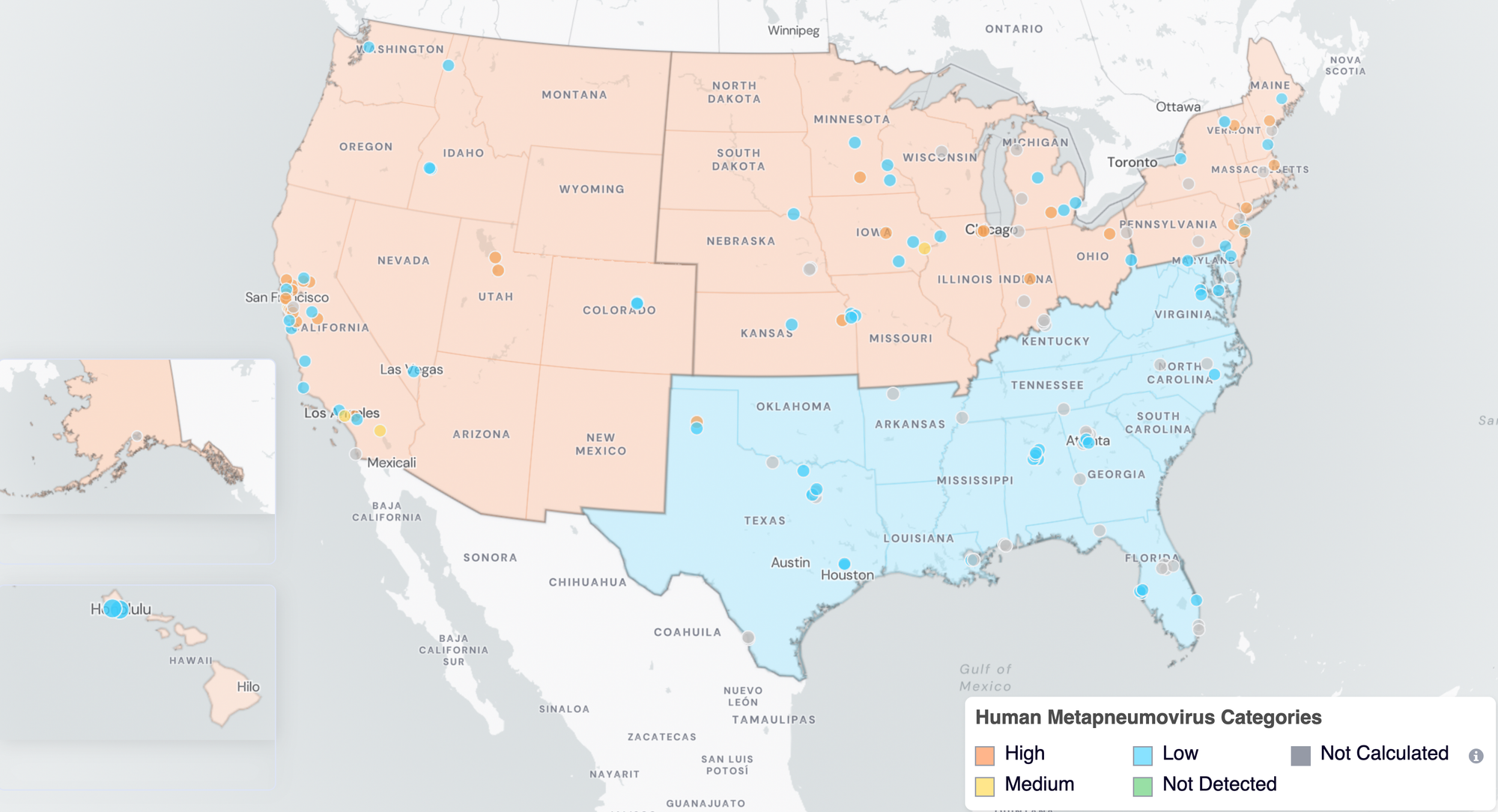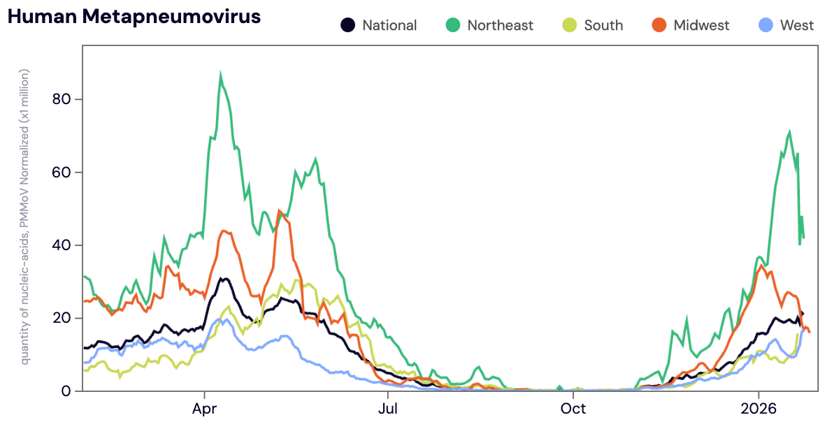 HMPV (human metapneumovirus) RNA was detected in ~60% of samples in January 2026. The median HMPV RNA concentrations across all sites in January 2026 was 5,042 copies per gram. HMPV concentrations have been steadily rising across all regions since late December 2025.