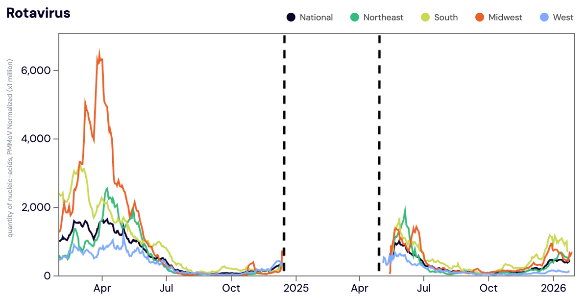 Rotavirus (Rota) RNA- In mid May 2025, we started measuring Rotavirus again. We previously paused measurements of Rota in December 2024 in order to being measuring Mpox clade Ib.